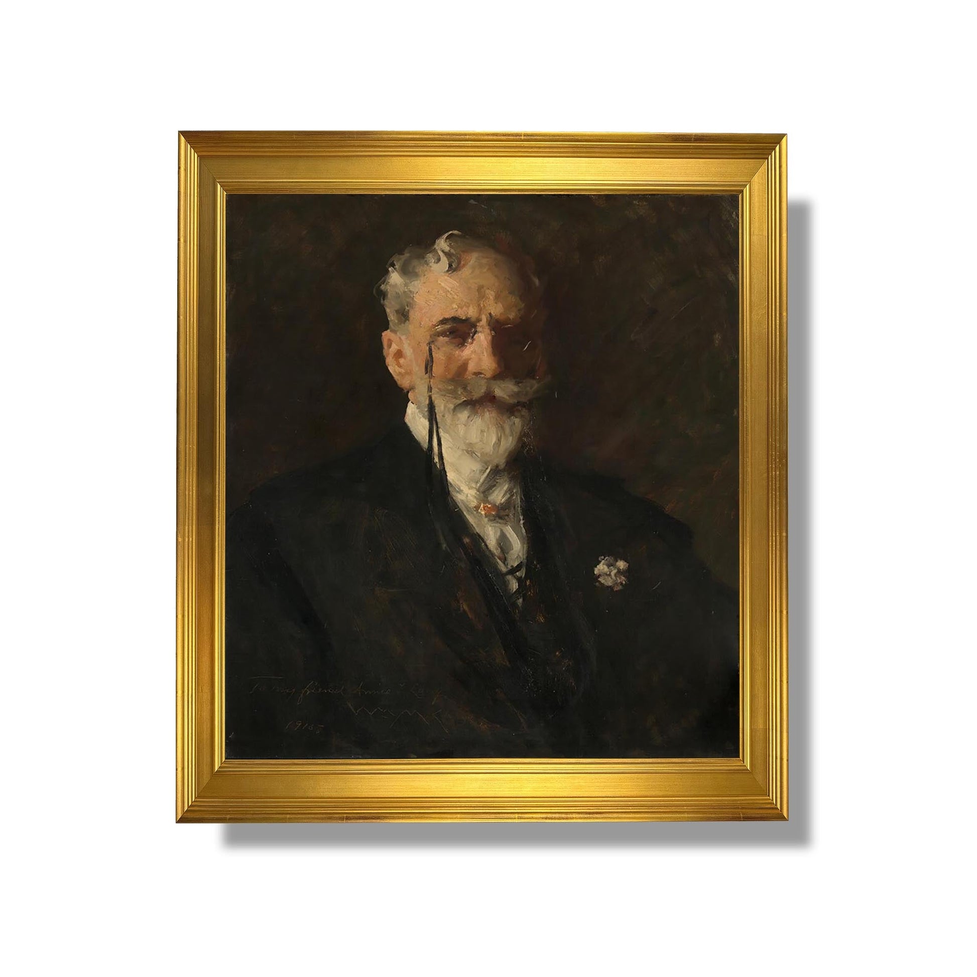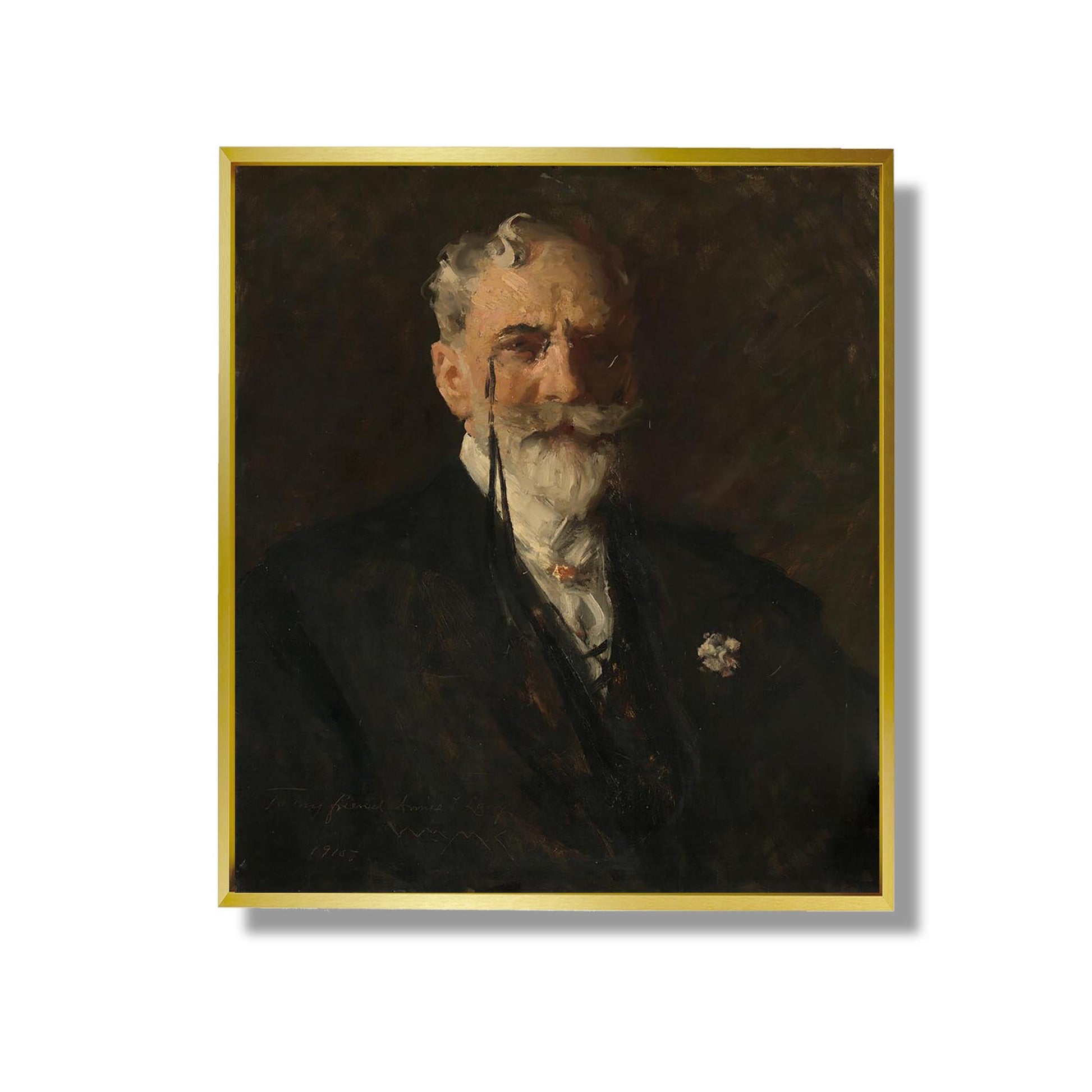 William Merritt Chase, peintre américain du XIXe siècle, est reconnu pour son œuvre "Self-Portrait", réalisée en 1900. Dans ce tableau, Chase se représente avec une maîtrise technique remarquable, utilisant des couleurs vives et des jeux de lumière pour capturer son essence. Le regard direct du peintre engage le spectateur, tandis que le fond flou met en valeur sa présence. Ce portrait témoigne de son style impressionniste, alliant réalisme et expressivité. Chase, influencé par la lumière et la couleur, explore l'identité et l'introspection, faisant de cette œuvre un reflet poignant de son parcours artistique.