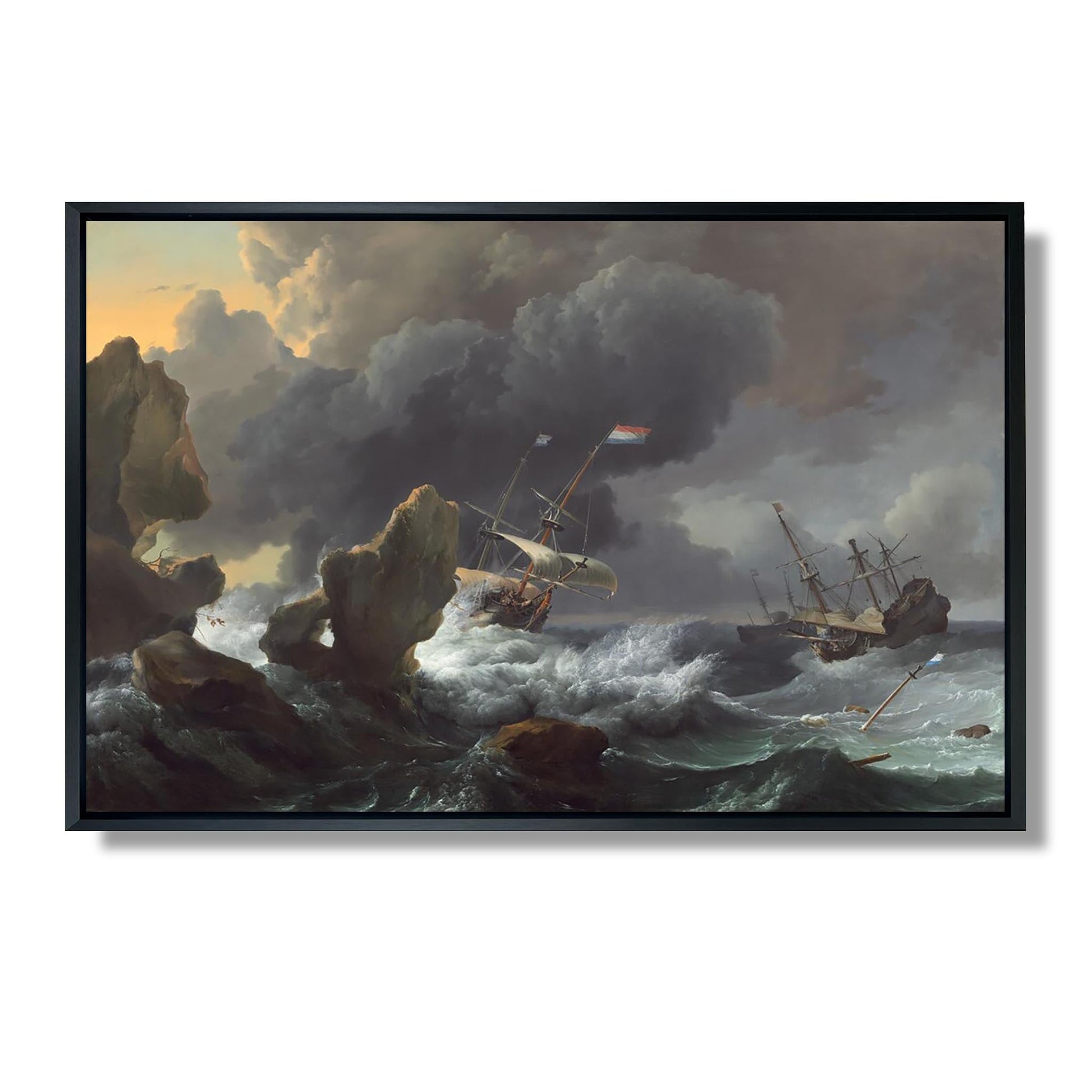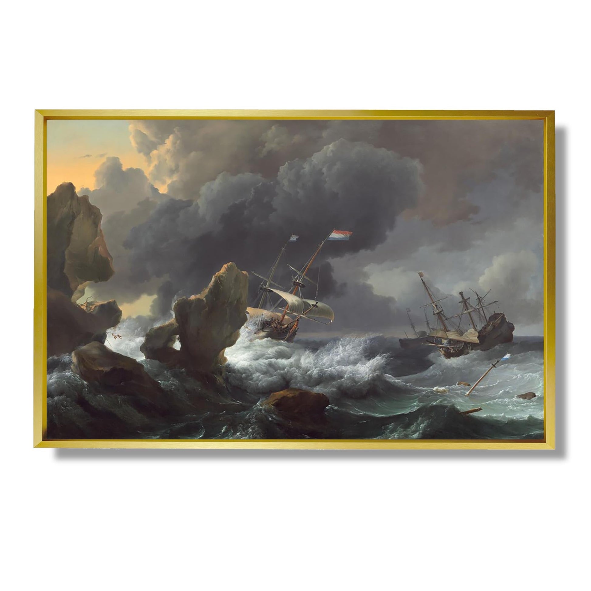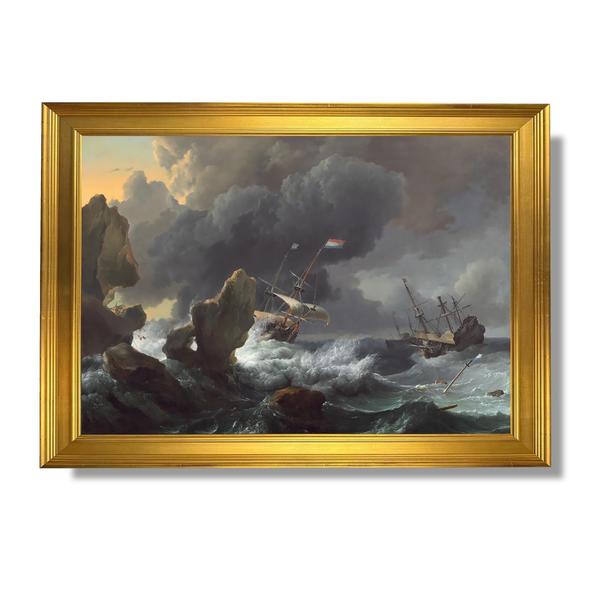 "Ships in Distress off a Rocky Coast" est une œuvre emblématique du peintre néerlandais Ludolf Backhuysen, réalisée au XVIIe siècle. Ce tableau illustre une scène maritime dramatique, où des navires luttent contre des vagues tumultueuses et des rochers menaçants. La maîtrise de Backhuysen dans le rendu des éléments naturels, tels que l'eau et le ciel, témoigne de son talent exceptionnel pour capturer la lumière et le mouvement. L'œuvre évoque à la fois la beauté et la dangerosité de la mer, reflétant les défis auxquels faisaient face les marins de l'époque. C'est un hommage à la bravoure humaine face aux forces de la nature.