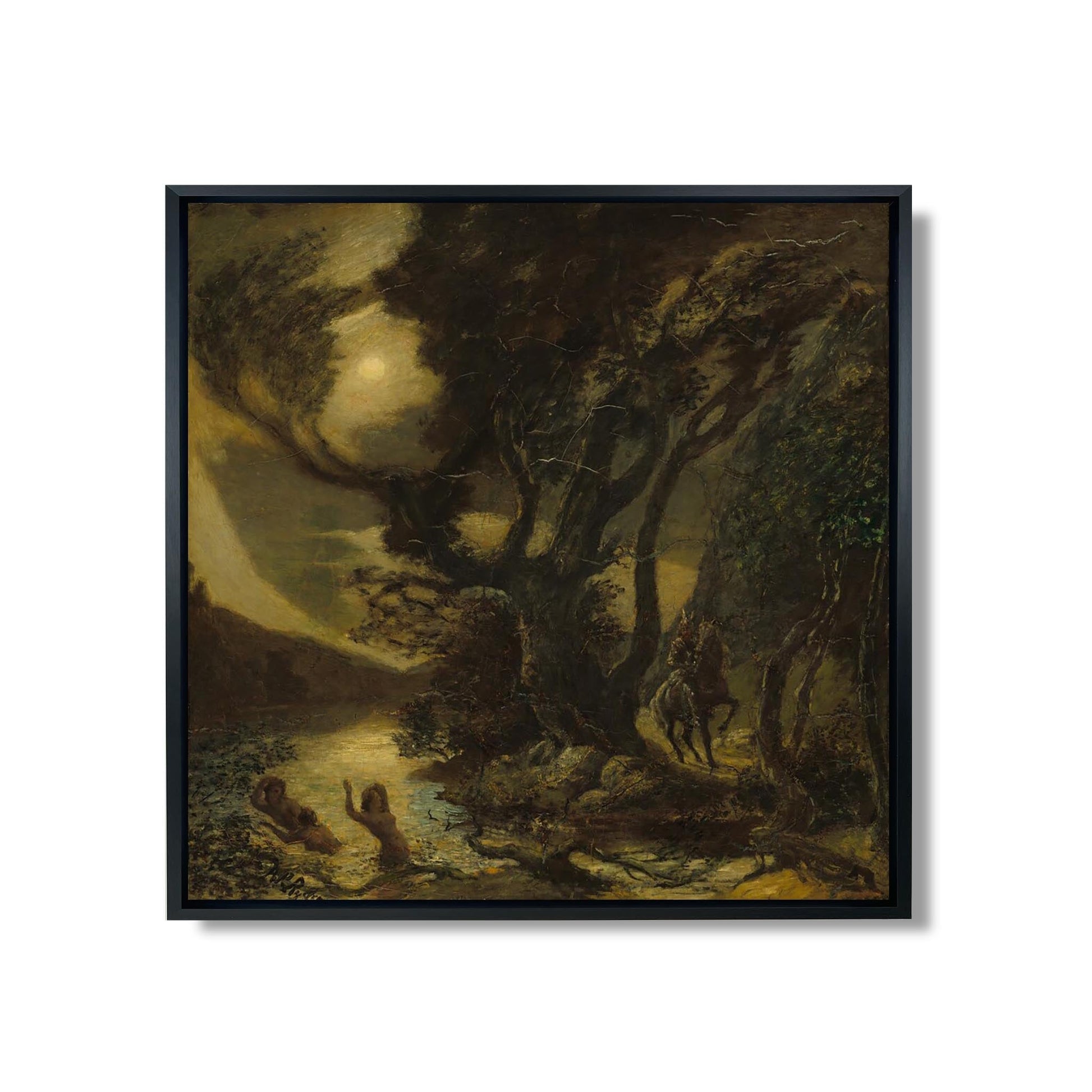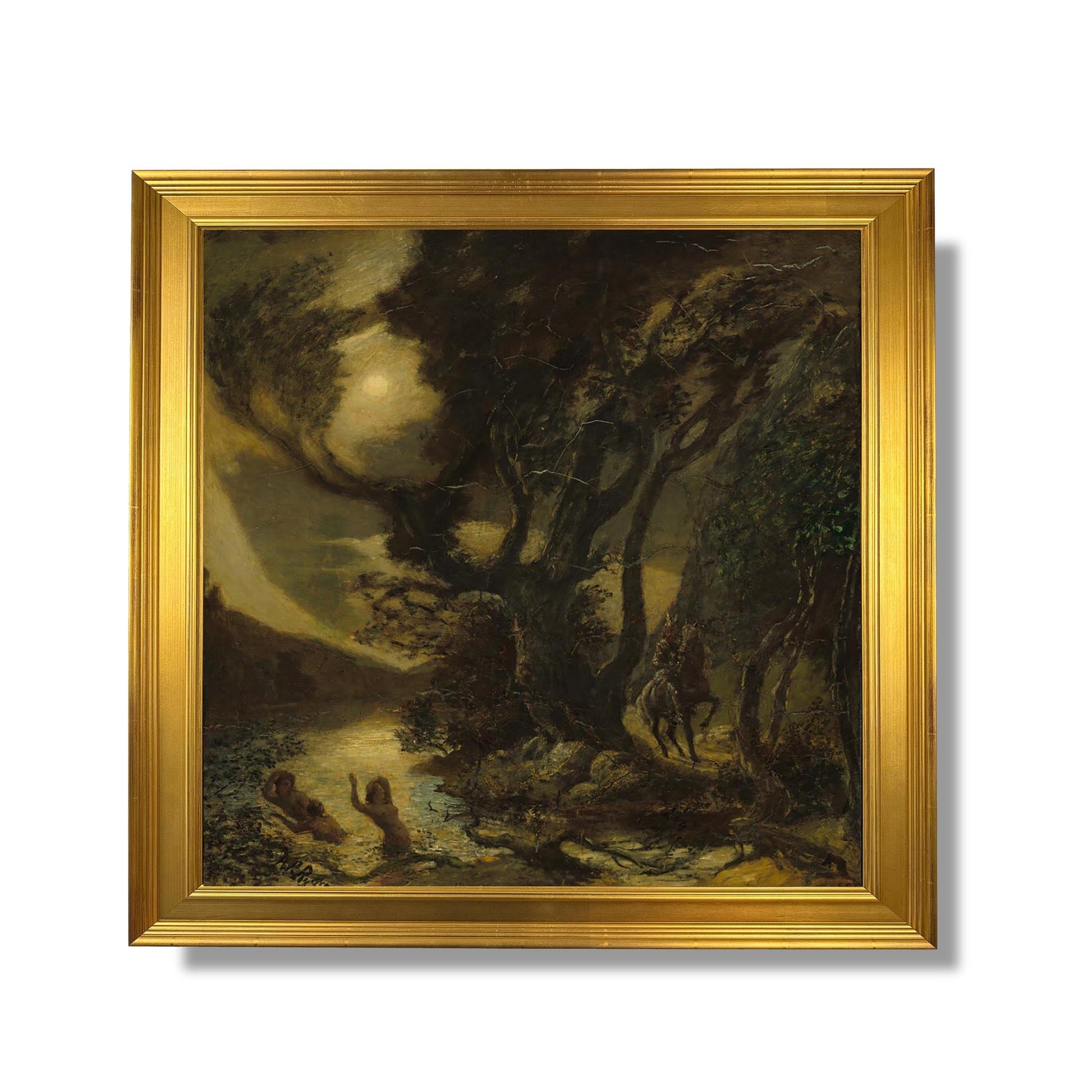 Albert Pinkham Ryder, peintre américain du XIXe siècle, est connu pour ses œuvres symbolistes et mystiques. Dans "Siegfried and the Rhine Maidens", il explore le mythe germanique à travers une composition riche en émotions. La toile représente Siegfried, héros légendaire, entouré des Nymphe du Rhin, créatures envoûtantes. Ryder utilise des couleurs sombres et des jeux de lumière pour créer une atmosphère à la fois mélancolique et mystérieuse. L'œuvre évoque des thèmes de désir, de sacrifice et de la lutte entre l'homme et le destin, révélant la profondeur psychologique des personnages et l'intensité de leur interaction.