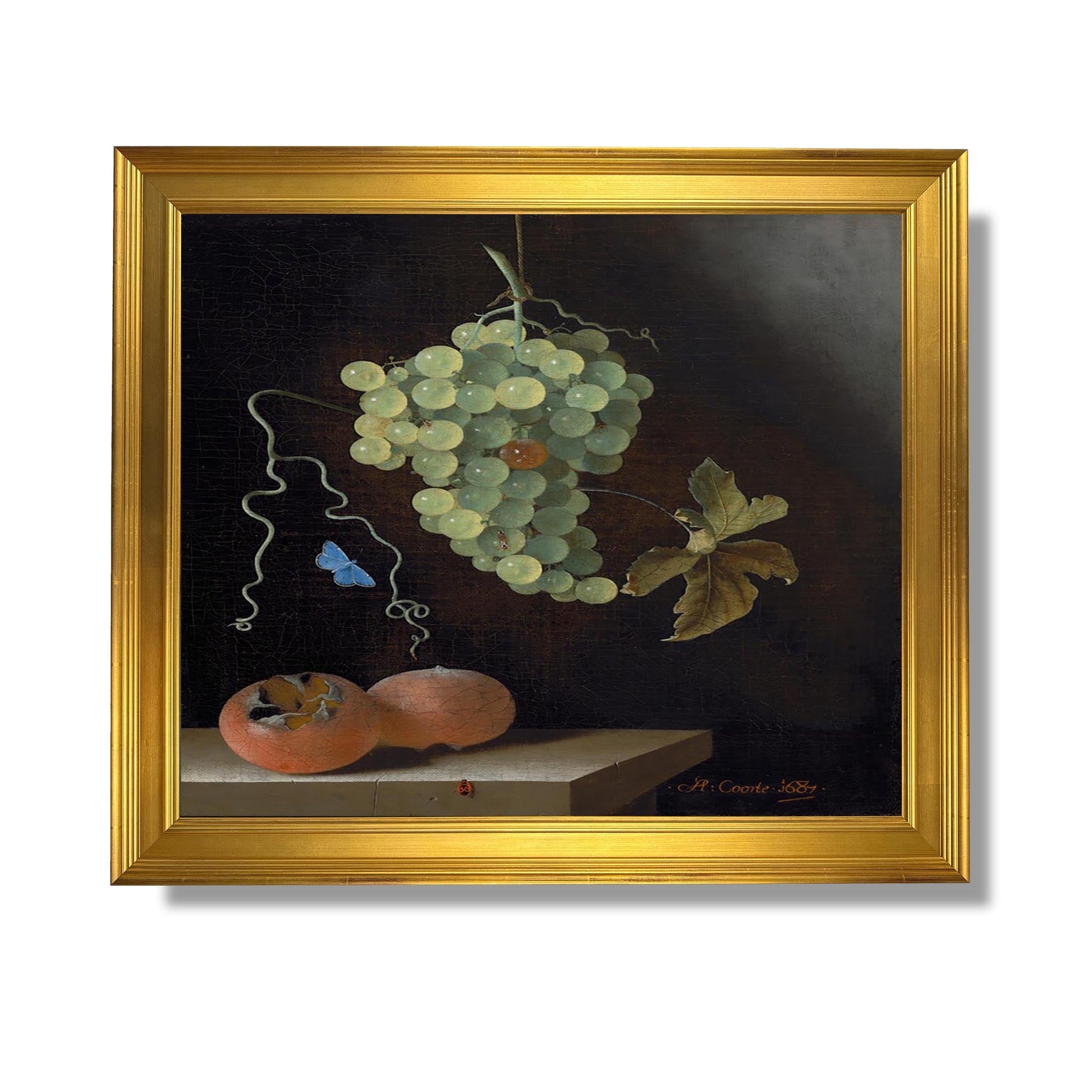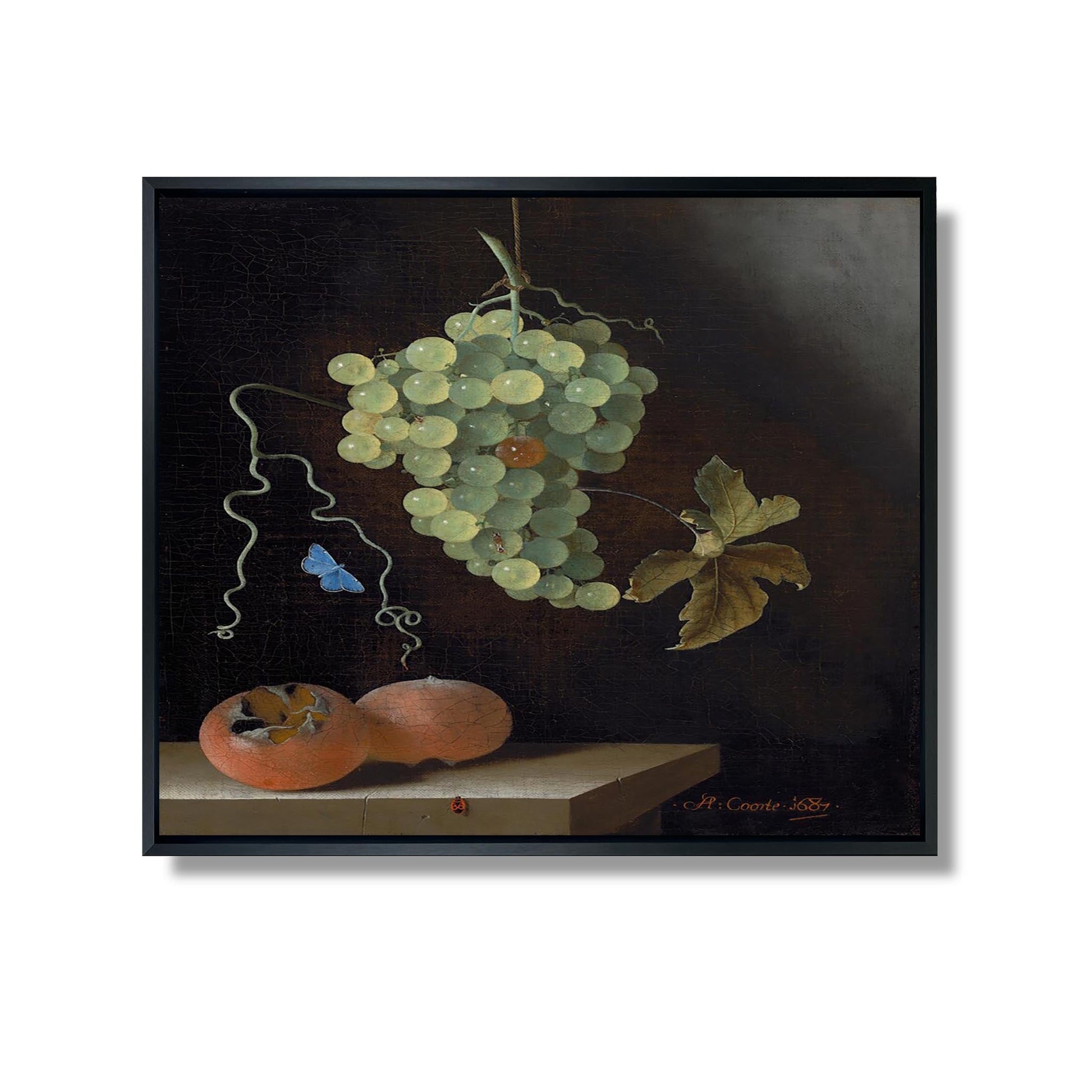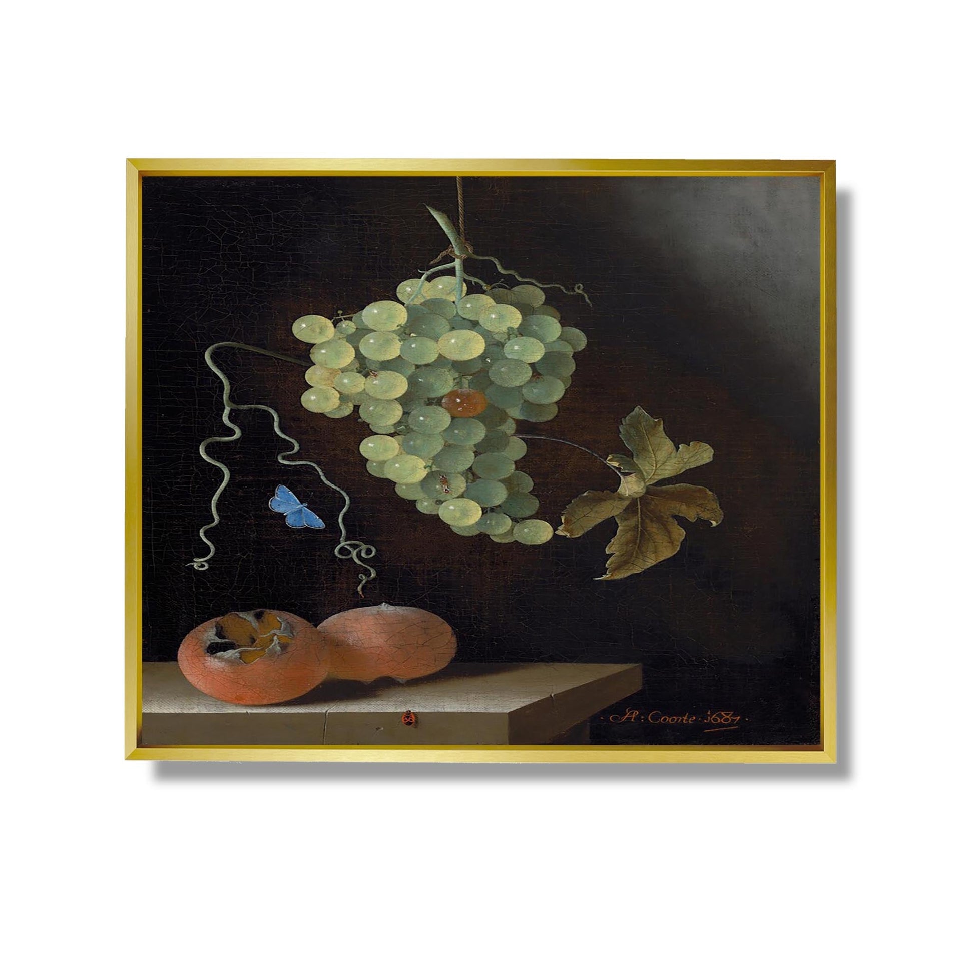 Still Life with a Hanging Bunch of Grapes, Two Medlars, and a Butterfly - Adriaen Coorte