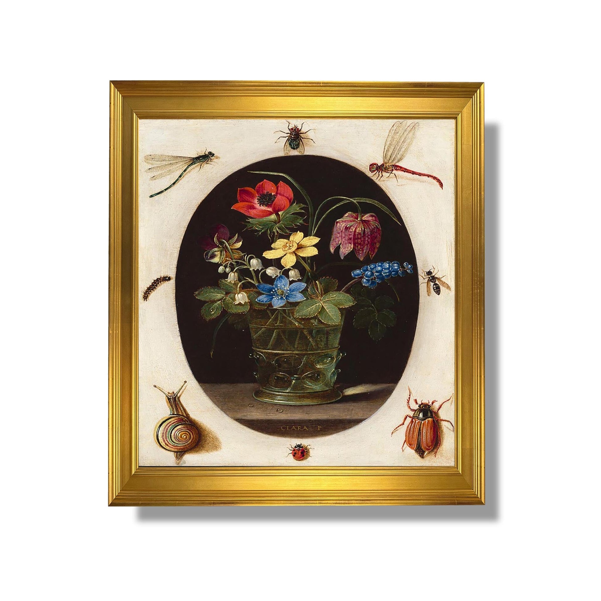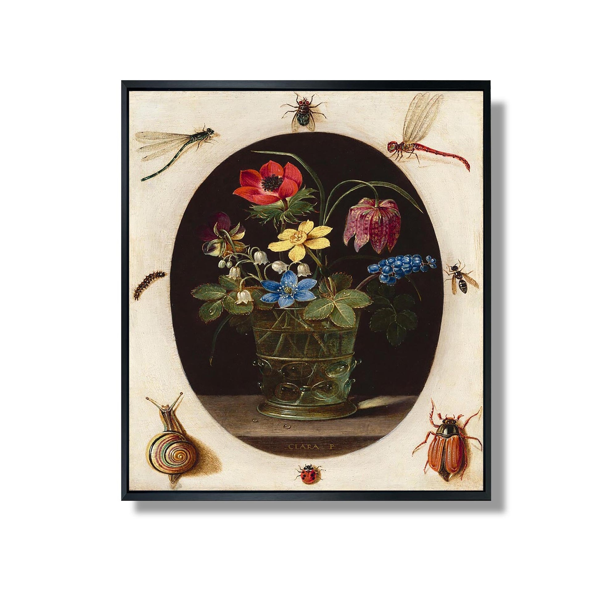 "Still Life with Flowers Surrounded by Insects and a Snail" est une œuvre emblématique de Clara Peeters, une pionnière de la nature morte au XVIIe siècle. Peeters, souvent reconnue pour sa maîtrise des détails, capture la beauté éphémère des fleurs, symboles de la vanité et de la fragilité de la vie. Dans cette composition, les insectes et un escargot ajoutent une dimension dynamique, soulignant l'interaction entre la vie et la mort. La palette riche et les textures délicates révèlent son habileté technique, tandis que l'arrangement harmonieux évoque une réflexion sur la nature et le passage du temps, caractéristiques de son style unique.