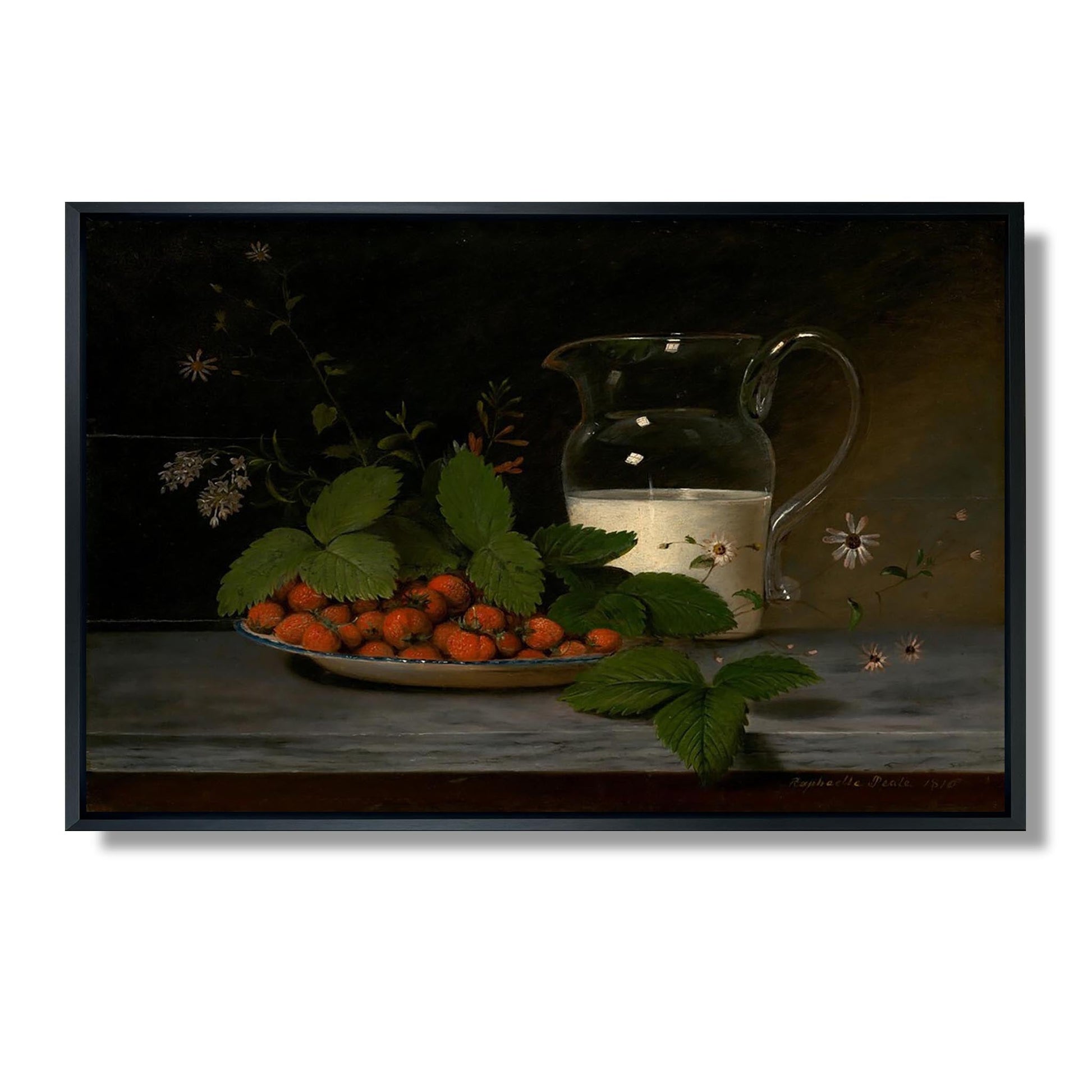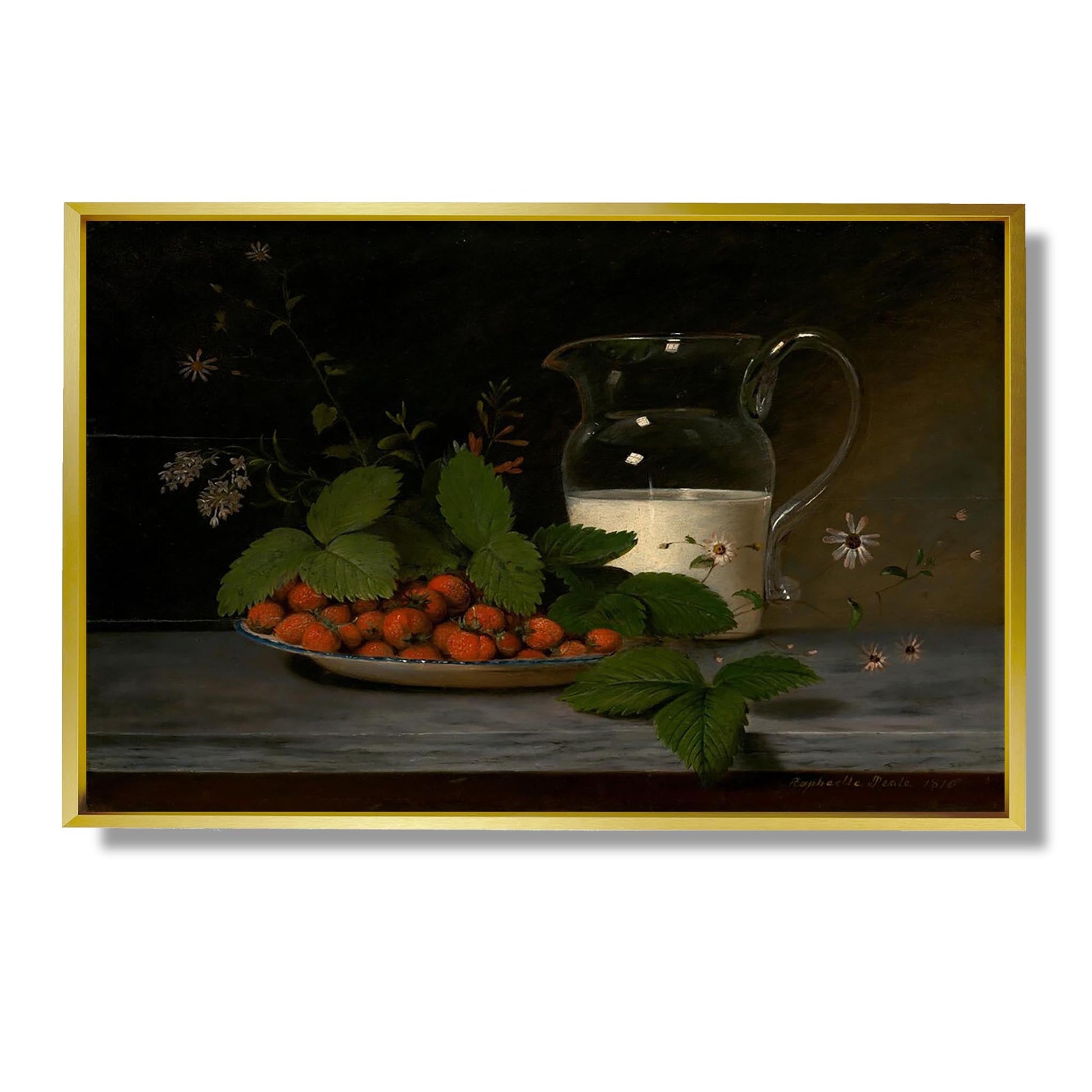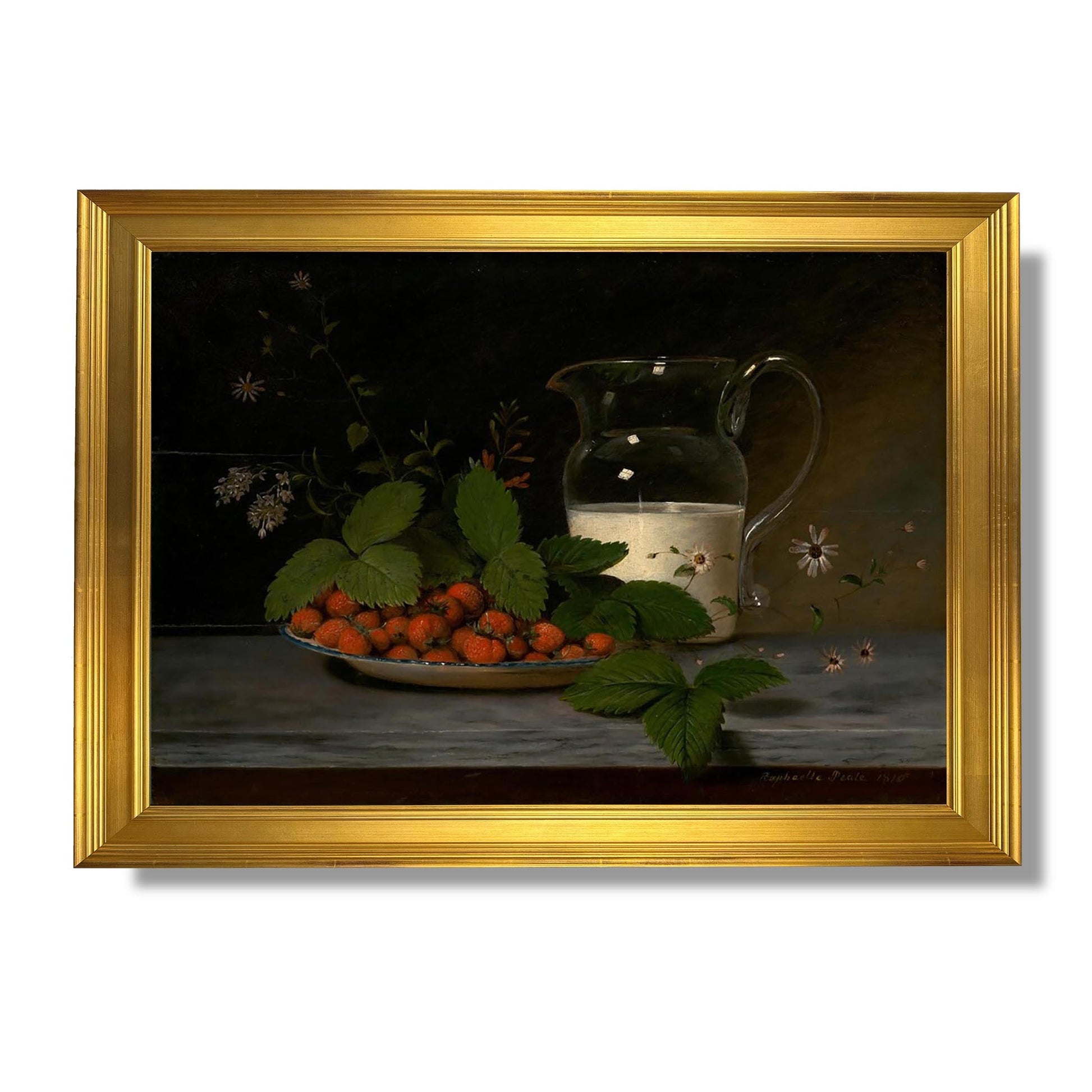 "Strawberries and Cream" de Raphaelle Peale, peint en 1820, est une œuvre emblématique du mouvement du réalisme américain. Ce tableau met en avant une composition délicate de fraises et de crème, présentée sur une table en bois. La lumière naturelle éclaire les textures riches des fruits et de la crème, créant un contraste saisissant. Peale, maître de la nature morte, capture non seulement la beauté des aliments, mais évoque également une sensation de fraîcheur et de simplicité. Cette œuvre illustre l'habileté de l'artiste à transformer des objets ordinaires en une célébration visuelle de la vie quotidienne.