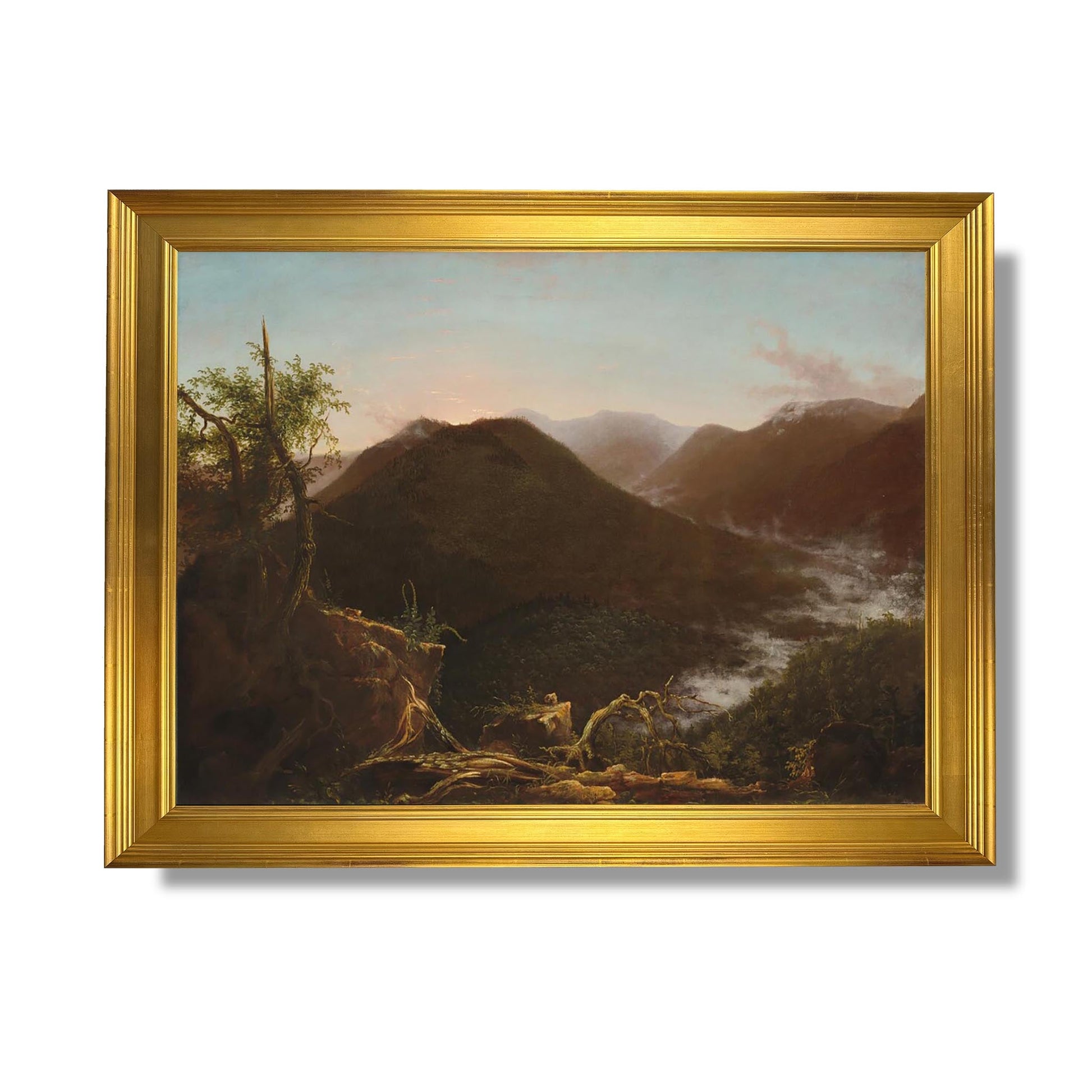 "Sunrise in the Catskills" est une œuvre emblématique de Thomas Cole, un pionnier du mouvement romantique américain. Peinte en 1843, cette toile capture la beauté majestueuse des montagnes des Catskills au lever du soleil. Cole utilise des couleurs vives et des contrastes saisissants pour évoquer la lumière dorée du matin, symbolisant l'espoir et le renouveau. La composition, avec ses éléments naturels, reflète l'harmonie entre l'homme et la nature, un thème central dans l'œuvre de Cole. Cette peinture incarne l'esprit de l'époque, célébrant la grandeur des paysages américains et l'importance de la préservation de la nature.