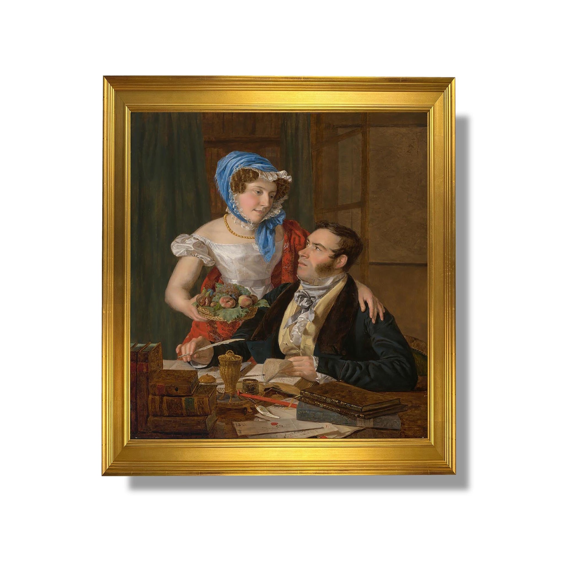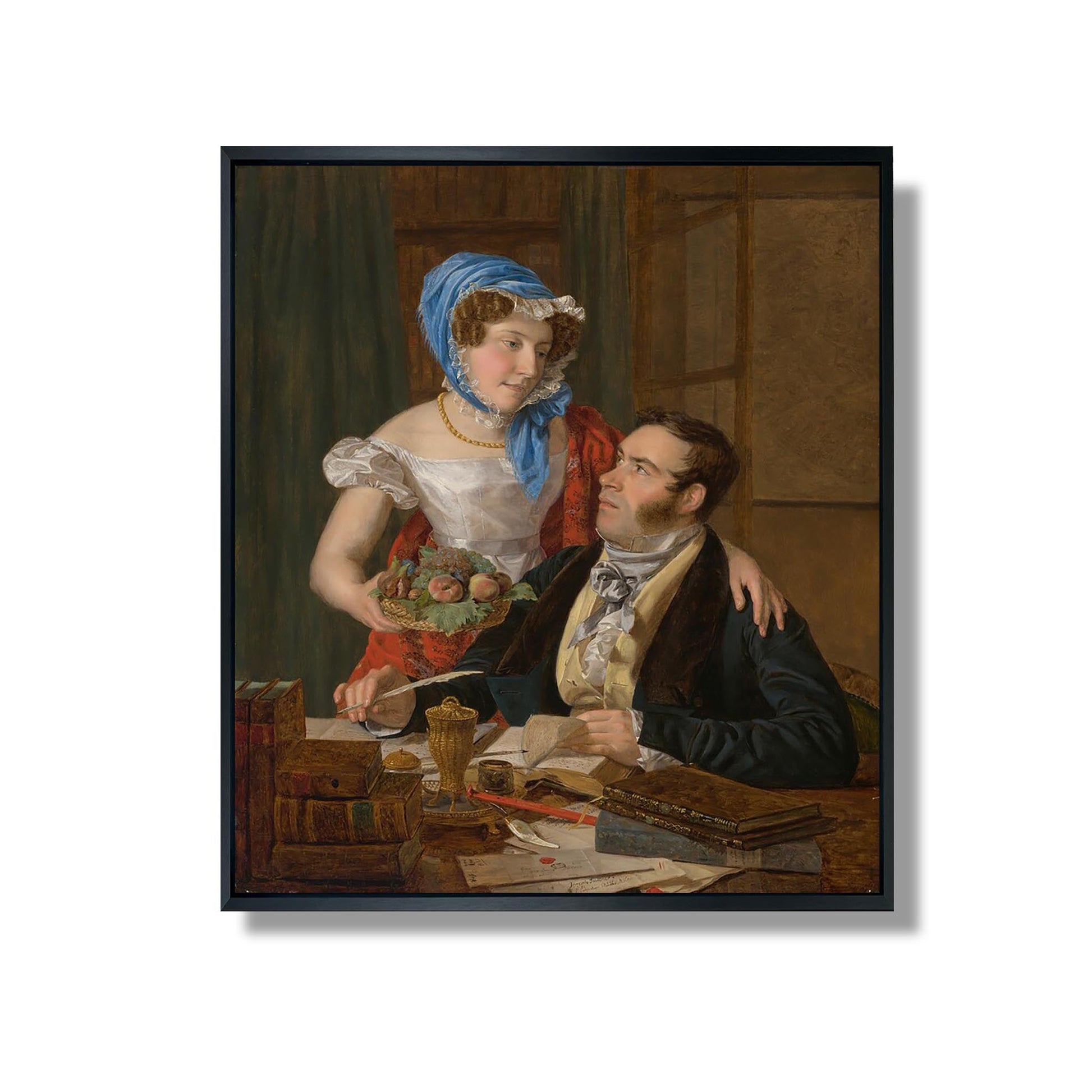 "The Cartographer Professor Josef Juttner and His Wife" est une œuvre emblématique de Ferdinand Georg Waldmüller, un peintre autrichien du XIXe siècle. Réalisée en 1855, cette peinture à l'huile capture un moment intime entre le professeur Juttner et sa femme, illustrant leur complicité intellectuelle et affective. Waldmüller, connu pour son réalisme et son attention aux détails, utilise une palette lumineuse pour mettre en valeur les expressions des personnages et l'environnement. L'œuvre reflète l'importance de la science et de l'éducation à l'époque, tout en célébrant la vie quotidienne et les relations humaines.