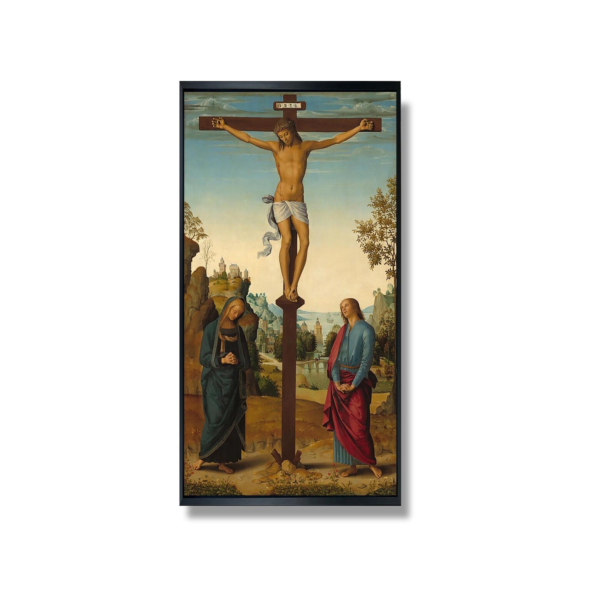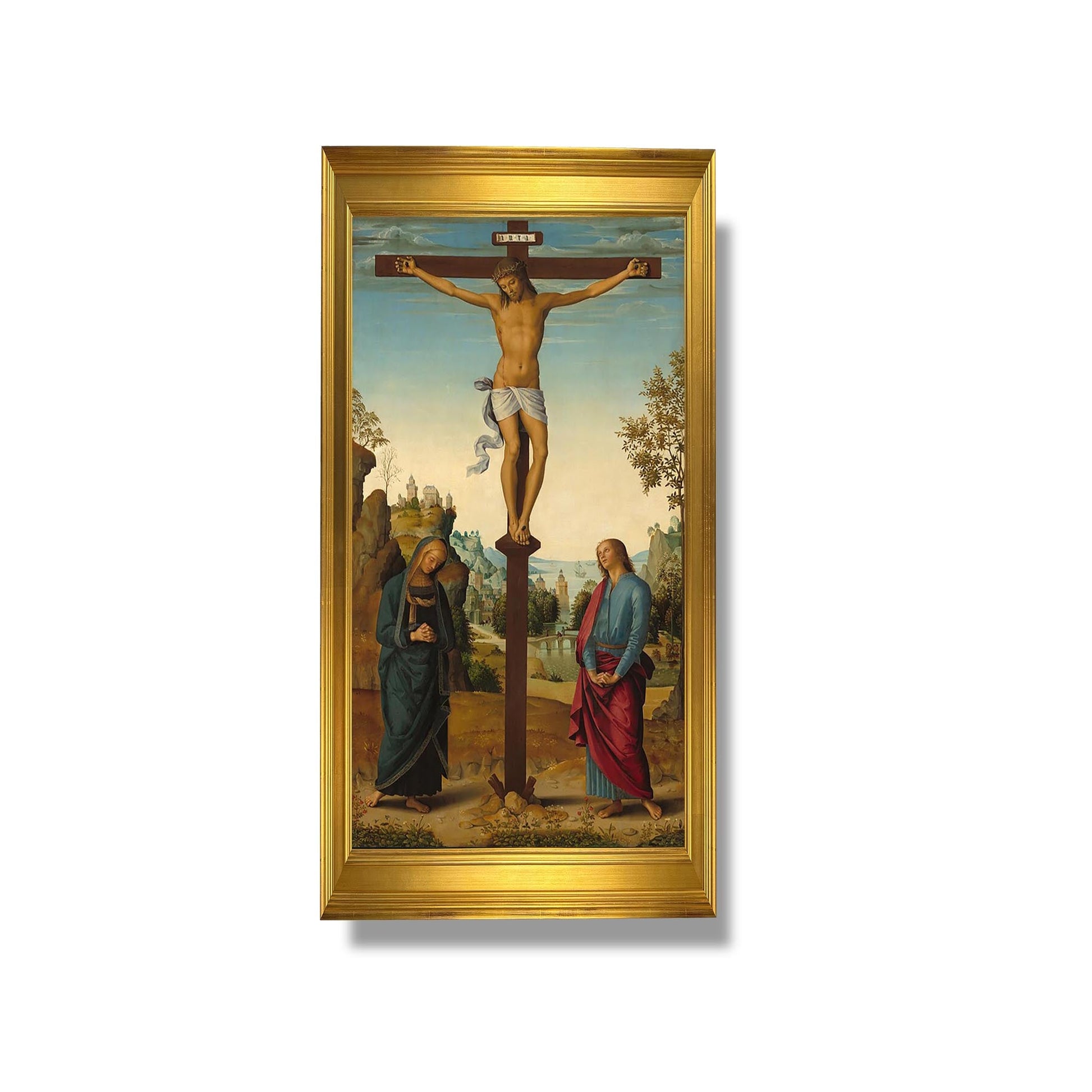 L'œuvre "La Crucifixion avec la Vierge, Saint Jean, Saint Jérôme et Sainte Marie Madeleine" de Pietro Perugino, réalisée à la fin du XVe siècle, est une représentation poignante de la Passion du Christ. Ce tableau illustre la crucifixion avec une composition équilibrée, où les figures sacrées sont disposées autour de la croix, exprimant une profonde émotion. La Vierge, Saint Jean, Saint Jérôme et Sainte Marie Madeleine incarnent la douleur et la compassion. Perugino, maître de la perspective et de la couleur, utilise des tons doux et des détails minutieux pour créer une atmosphère spirituelle, invitant le spectateur à la méditation.