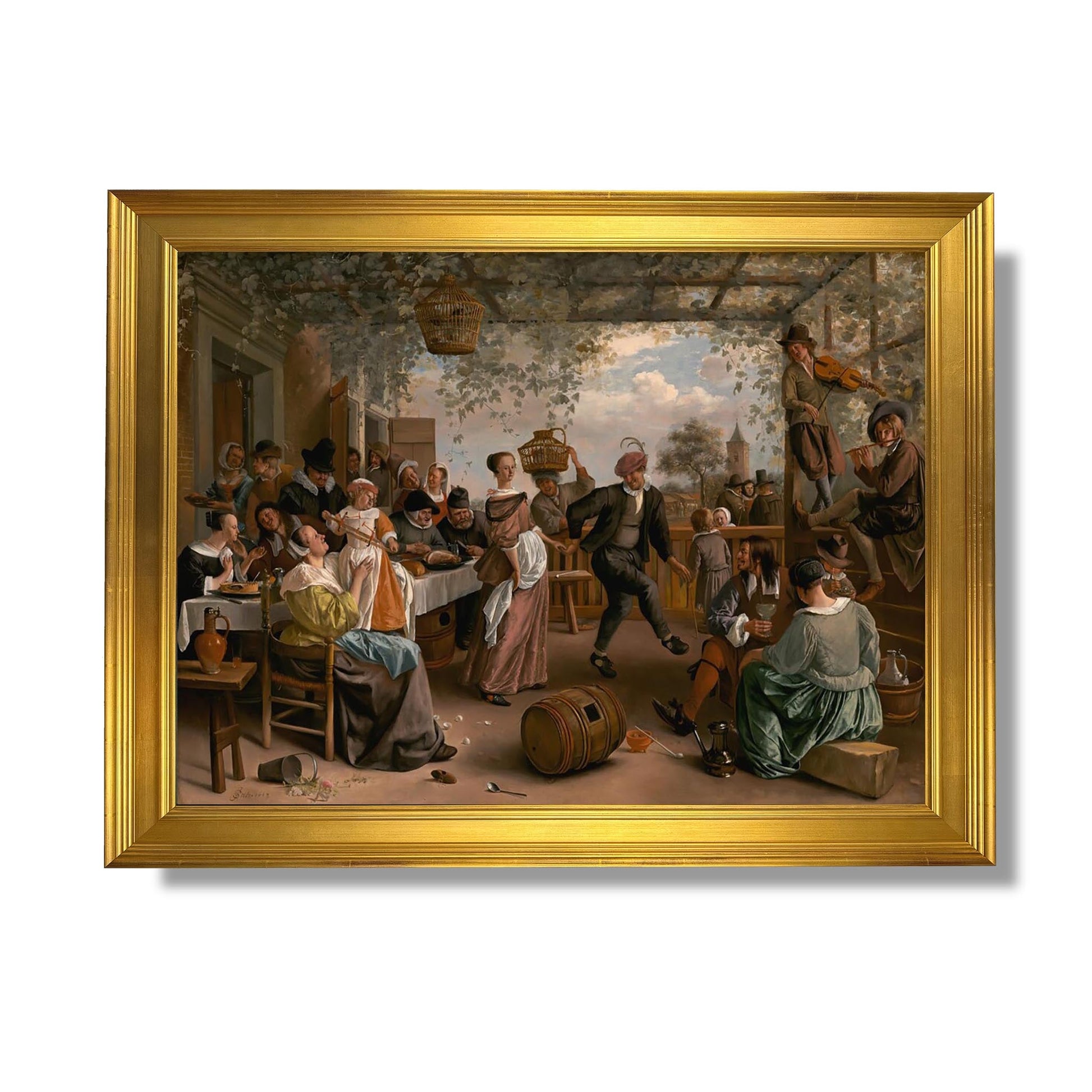"The Dancing Couple" de Jan Steen est une œuvre emblématique du XVIIe siècle, illustrant la vie quotidienne hollandaise avec une touche de joie et de désinvolture. La scène dépeint un couple dansant au milieu d'une fête, entouré d'invités qui s'amusent. Steen, connu pour son sens de l'humour et sa capacité à capturer les émotions humaines, utilise des couleurs vives et des détails minutieux pour créer une atmosphère vivante. Cette peinture reflète non seulement la culture festive de l'époque, mais aussi les thèmes de l'amour, de la convivialité et des plaisirs simples de la vie.