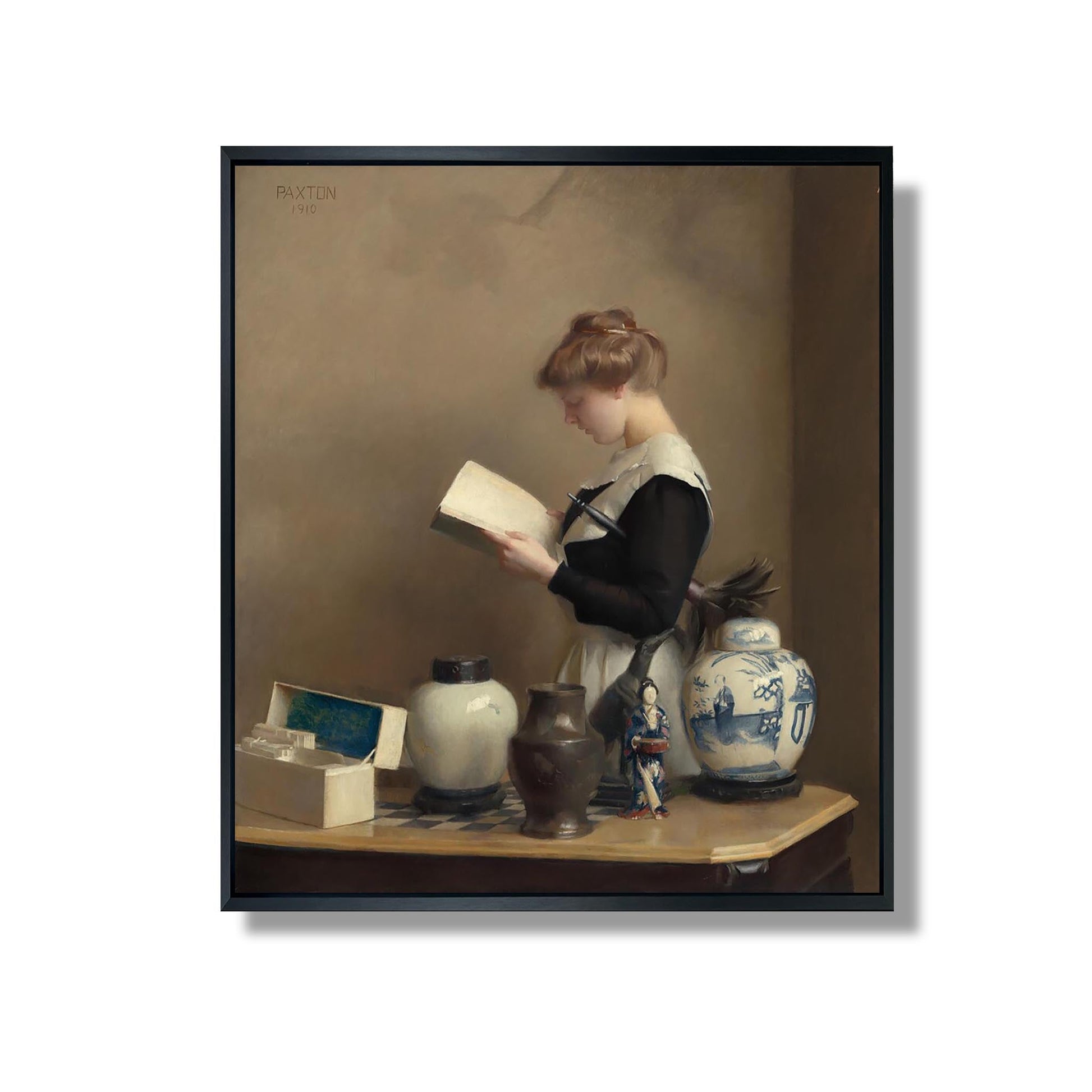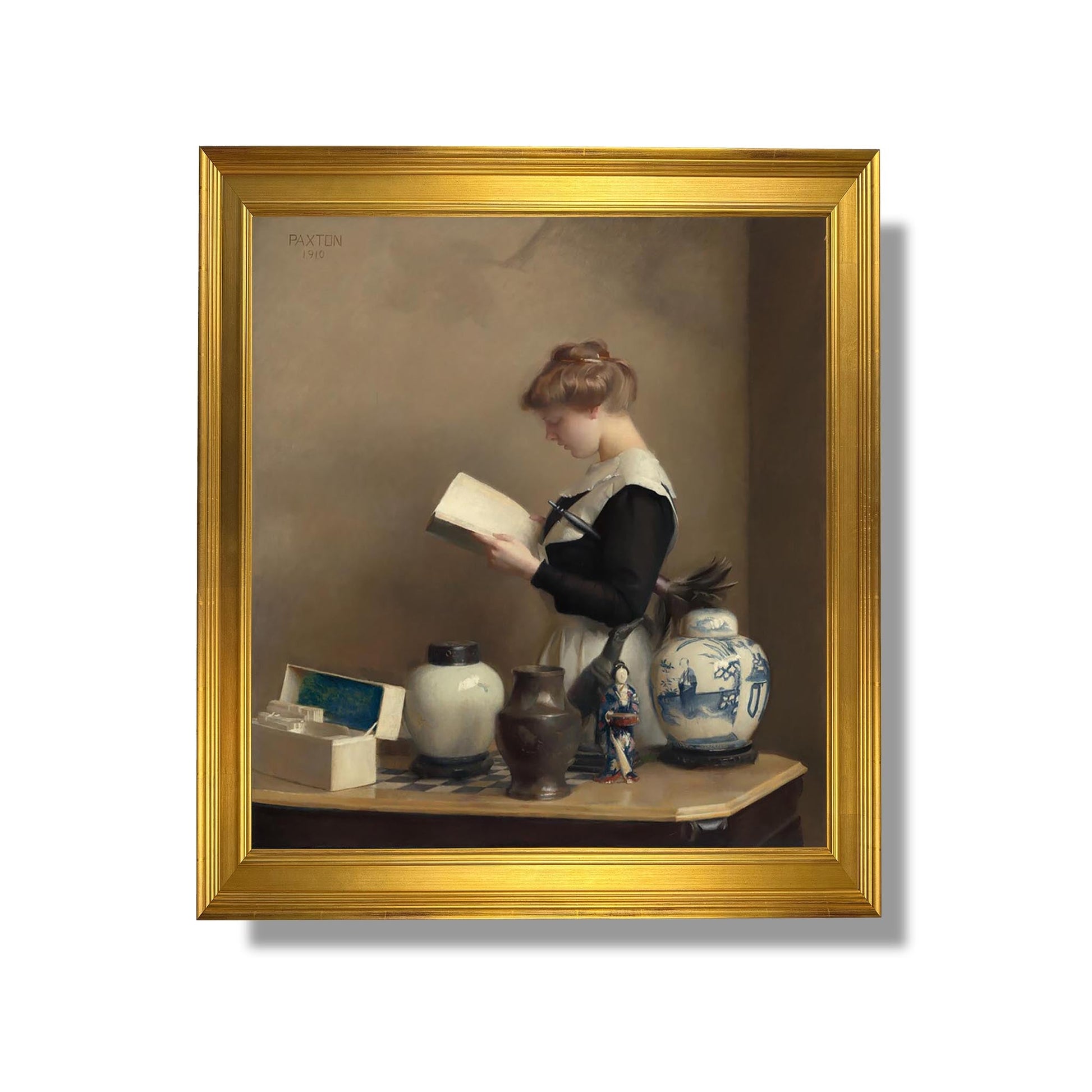 William McGregor Paxton, peintre américain du début du XXe siècle, est reconnu pour ses œuvres qui capturent la beauté de la vie quotidienne. Dans "The House Maid", il dépeint une jeune femme en train de s'occuper des tâches ménagères, illustrant à la fois la simplicité et la dignité du travail domestique. La lumière douce et les couleurs chaudes créent une atmosphère intime, tandis que la composition met en valeur la grâce de la protagoniste. Paxton, influencé par le mouvement impressionniste, réussit à allier réalisme et sensibilité, rendant hommage à la vie ordinaire avec une touche de poésie.