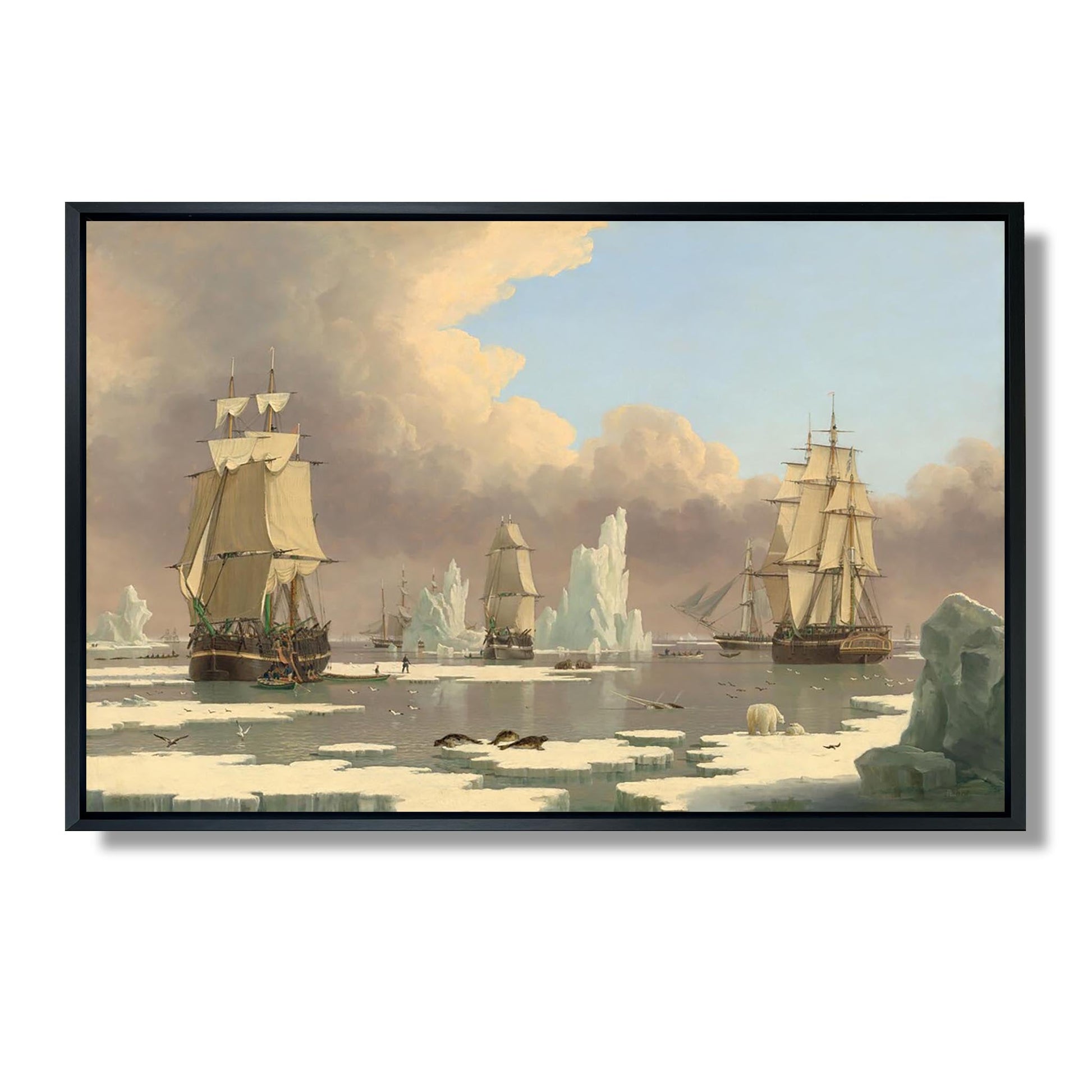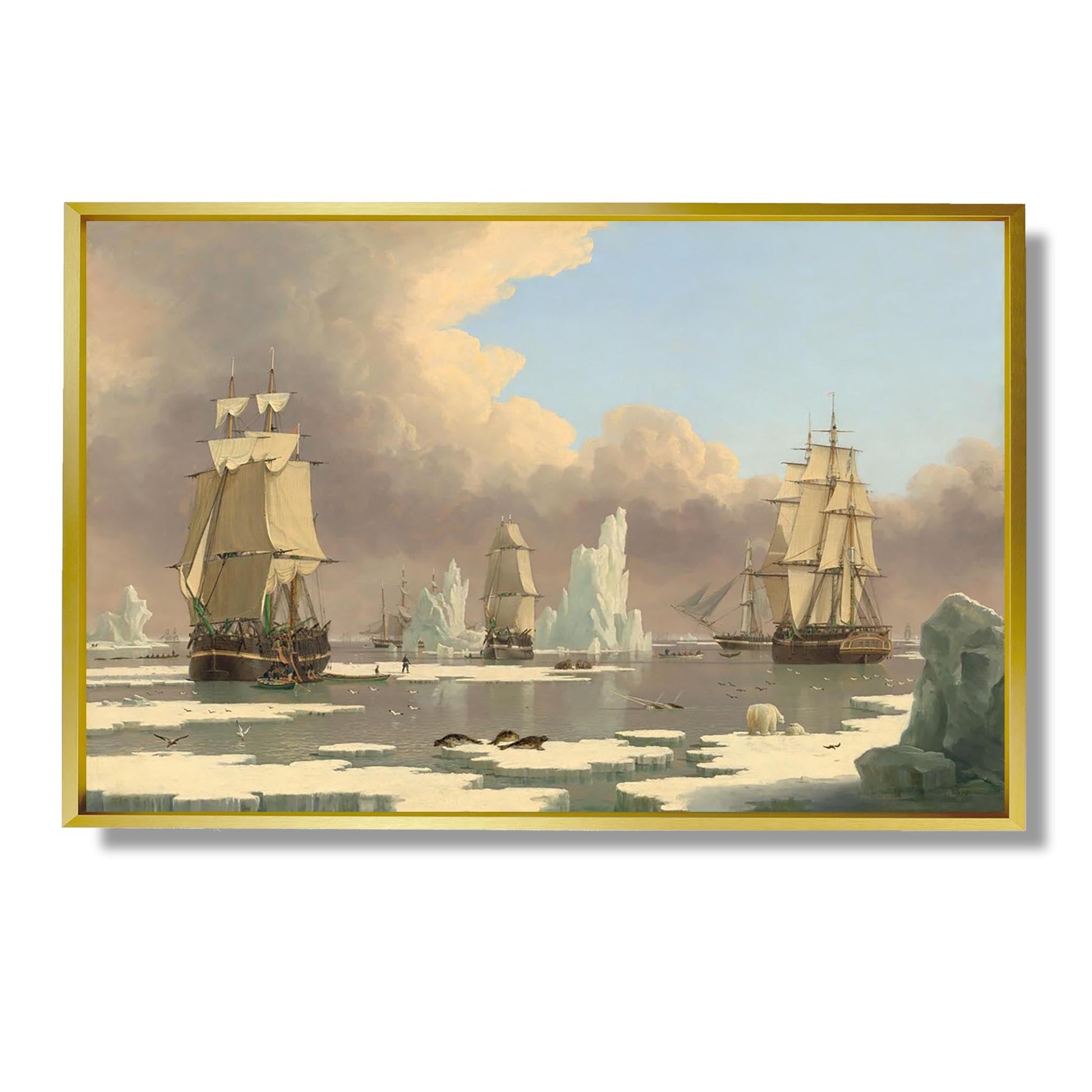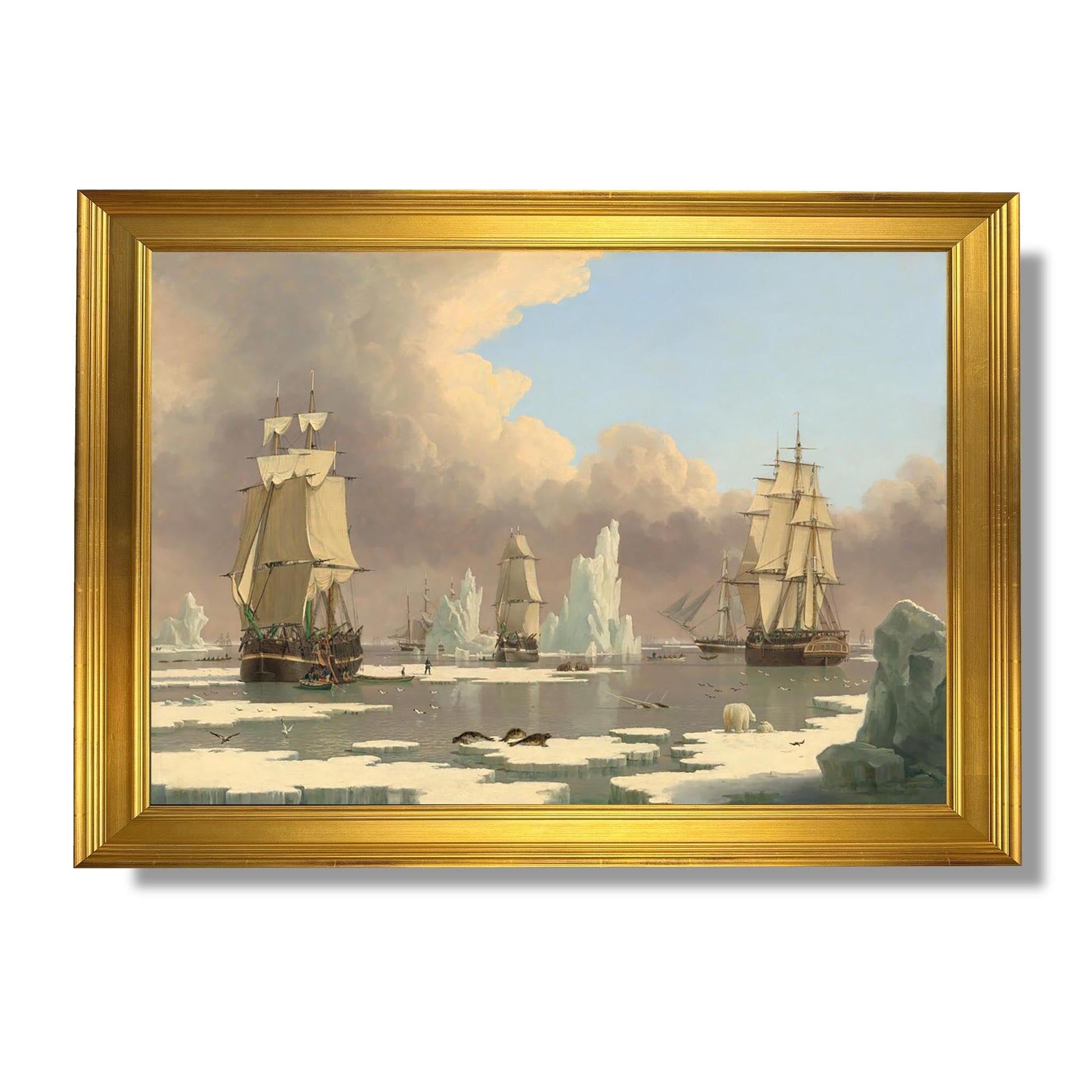 "The Northern Whale Fishery: The 'Swan' and 'Isabella'" est une œuvre emblématique de John Ward, un artiste britannique du XIXe siècle. Cette peinture illustre la chasse à la baleine dans les eaux arctiques, mettant en scène les navires "Swan" et "Isabella". Ward capture avec précision l'intensité et le danger de cette activité maritime, tout en soulignant la beauté sauvage des paysages nordiques. Les détails minutieux des bateaux et des baleines témoignent de son habileté technique. À travers cette œuvre, Ward évoque à la fois l'esprit d'aventure et les défis de la pêche à la baleine, tout en sensibilisant à la fragilité des écosystèmes marins.
