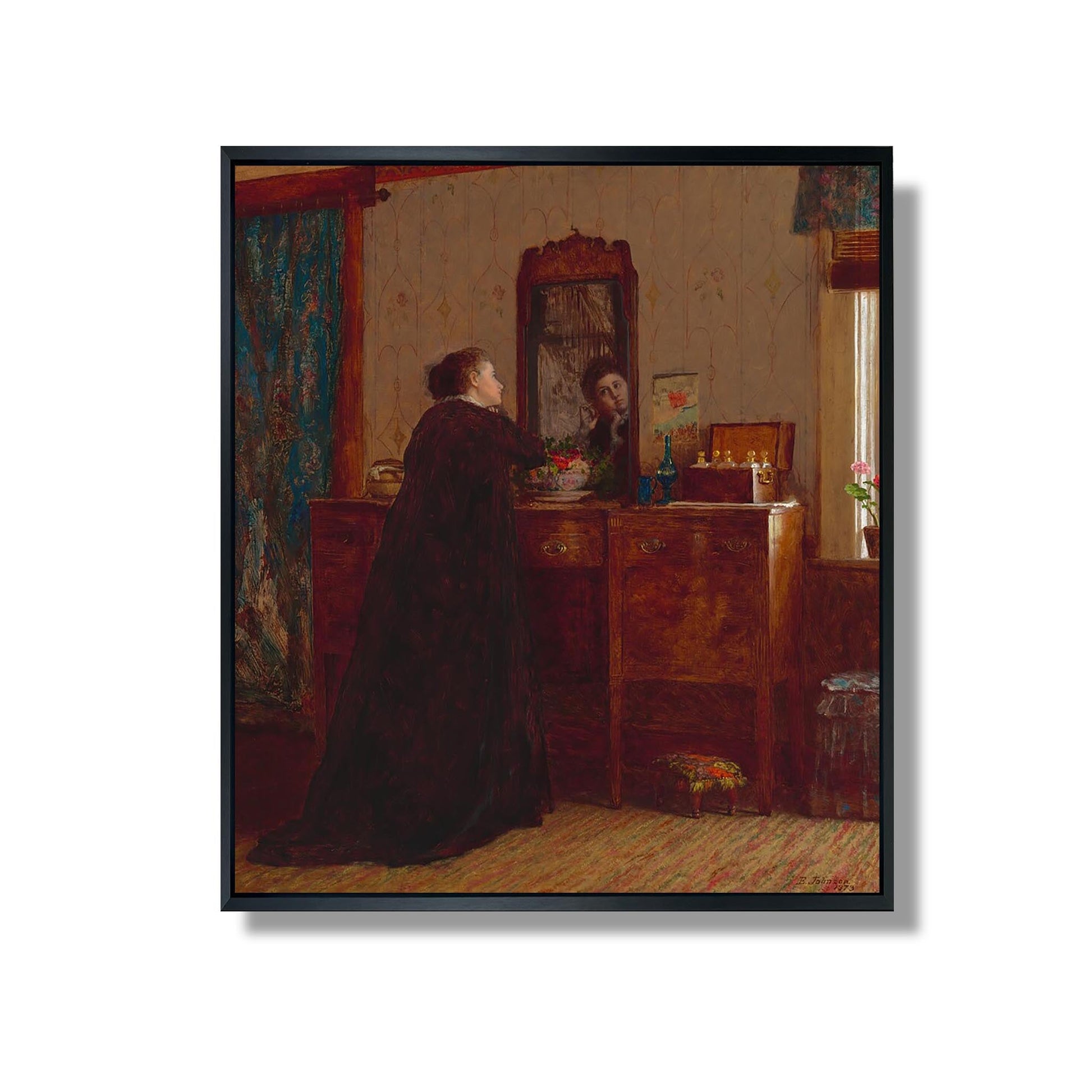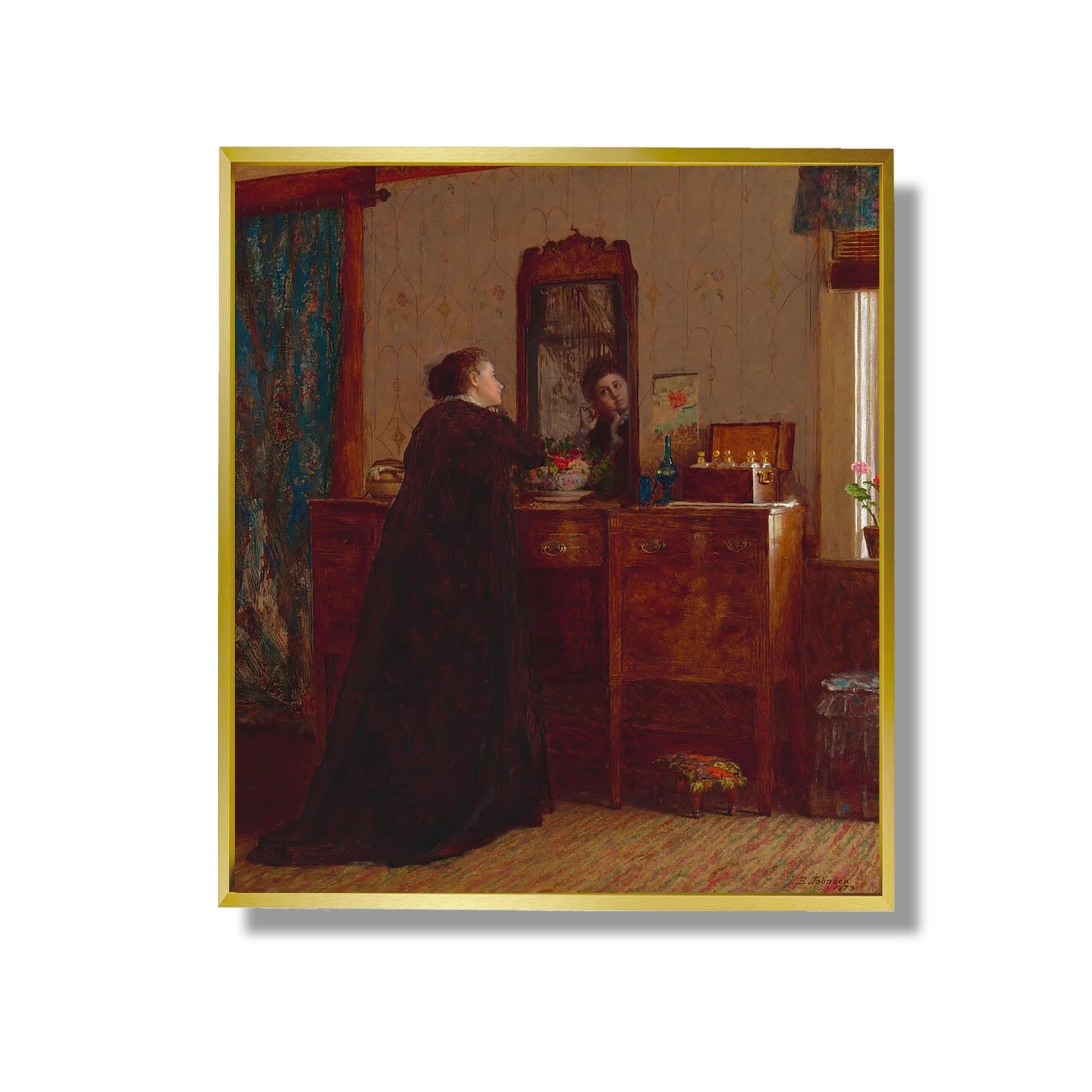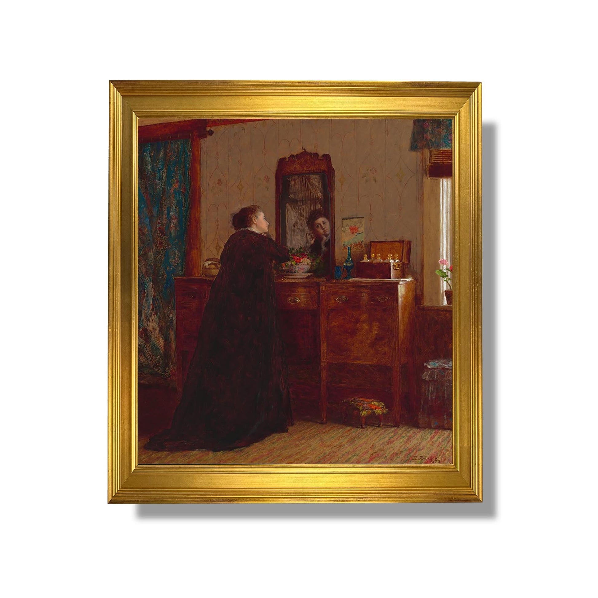 "The Toilet" d'Eastman Johnson, peint en 1876, est une œuvre emblématique du réalisme américain. Ce tableau représente une jeune femme dans un intérieur intime, se préparant devant un miroir. La lumière douce qui filtre à travers la fenêtre met en valeur les détails délicats de son visage et de sa robe. Johnson capture un moment de vie quotidienne, révélant la beauté et la vulnérabilité de son sujet. L'œuvre évoque des thèmes de féminité et d'introspection, tout en témoignant de l'habileté de l'artiste à jouer avec la lumière et l'espace. C'est une célébration de la vie domestique et des émotions humaines.