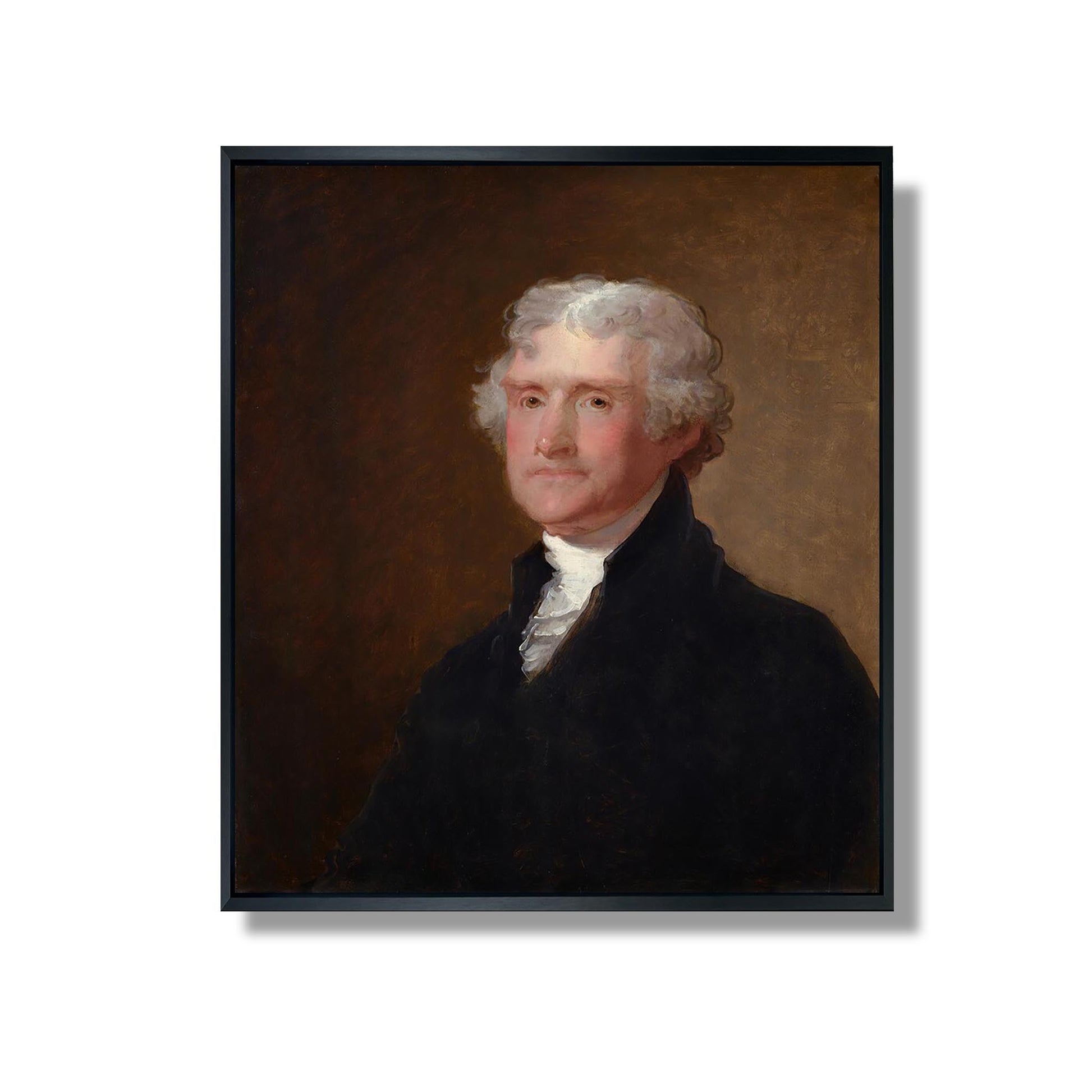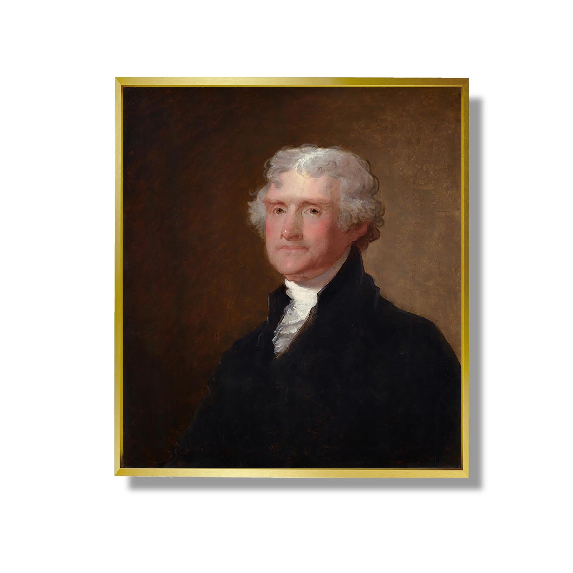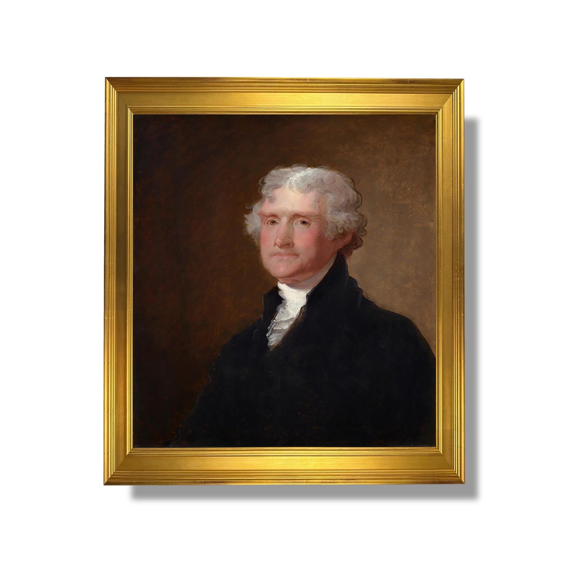 L'œuvre "Thomas Jefferson" de Gilbert Stuart, réalisée en 1805, est un portrait emblématique du troisième président des États-Unis. Stuart, maître du portrait américain, capture l'essence de Jefferson avec une grande finesse. Le tableau, qui se distingue par son réalisme et sa profondeur psychologique, montre Jefferson dans une pose réfléchie, vêtu d'un habit sombre, avec un regard pénétrant. Ce portrait illustre non seulement la stature politique de Jefferson, mais aussi son intellect et sa vision. L'œuvre est devenue un symbole de l'identité américaine et témoigne du talent de Stuart pour immortaliser des figures historiques.