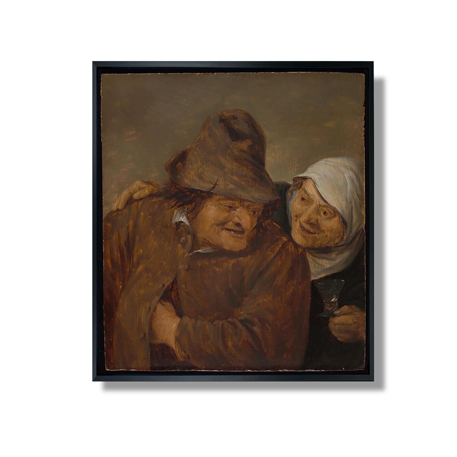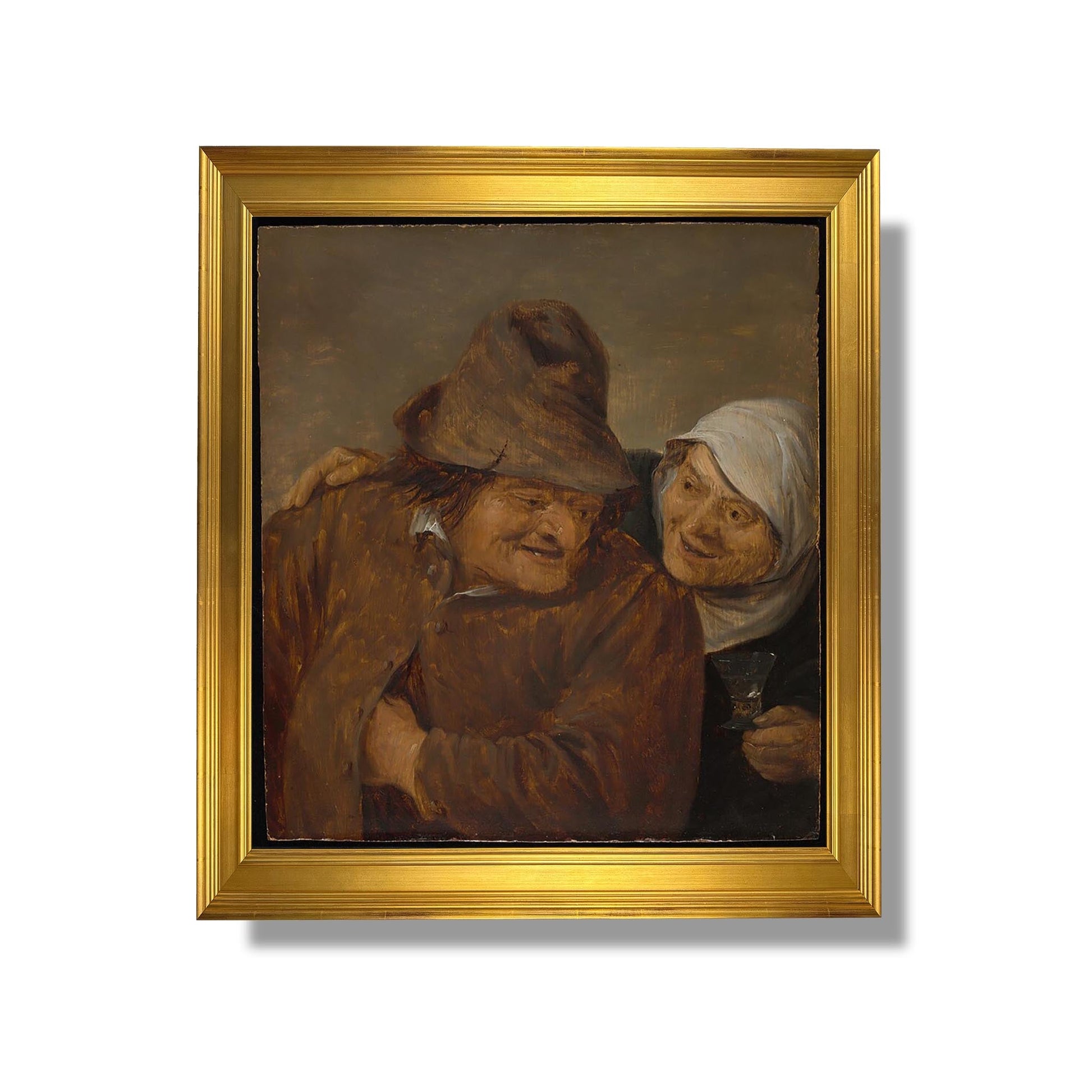 "Two Peasants with a Glass of Wine" est une œuvre emblématique de David Teniers le Jeune, un maître flamand du XVIIe siècle. Cette peinture illustre la vie quotidienne des paysans, capturant un moment de convivialité et de simplicité. Les deux personnages, assis autour d'une table rustique, partagent un verre de vin, symbolisant la camaraderie et le plaisir des petites choses. Teniers utilise des couleurs chaudes et une lumière douce pour créer une atmosphère intime. L'œuvre reflète son intérêt pour la vie populaire et la nature humaine, tout en démontrant son habileté technique et son sens du détail.
