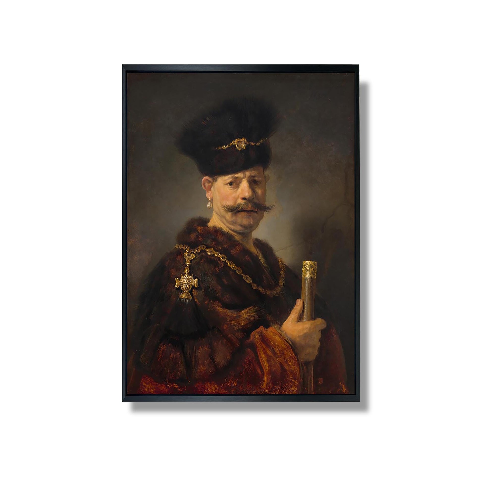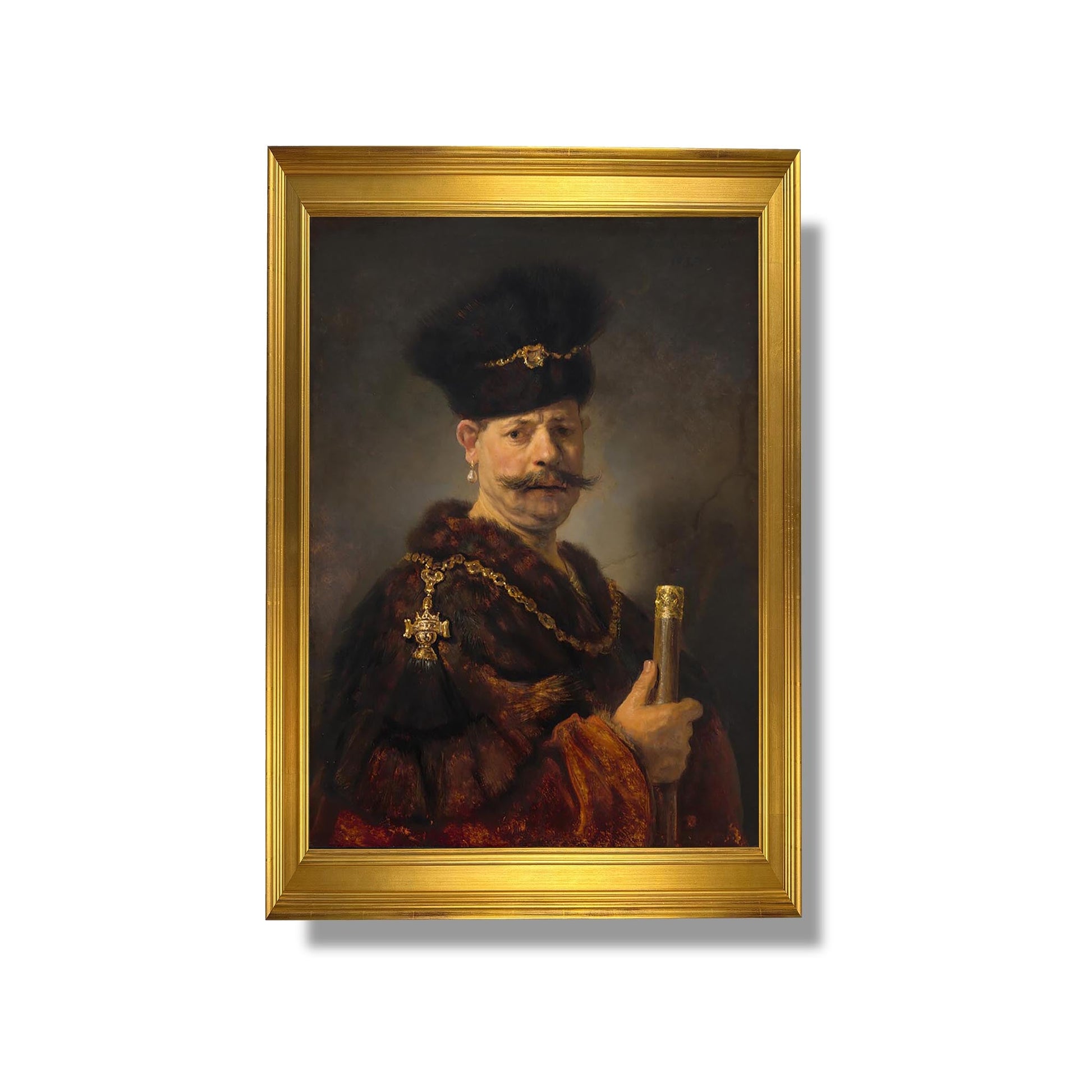 "Un noble polonais" est une œuvre emblématique de Rembrandt, peinte en 1637. Ce portrait représente un aristocrate polonais, vêtu d'une riche tenue ornée de détails raffinés, qui témoigne du statut social élevé du sujet. La maîtrise de Rembrandt dans l'utilisation de la lumière et de l'ombre, connue sous le nom de clair-obscur, confère une profondeur émotionnelle à l'œuvre. Le regard intense du noble, associé à une posture confiante, évoque à la fois la dignité et la mélancolie. Ce tableau illustre le talent de Rembrandt pour capturer la psychologie humaine, faisant de lui un maître incontesté du portrait.