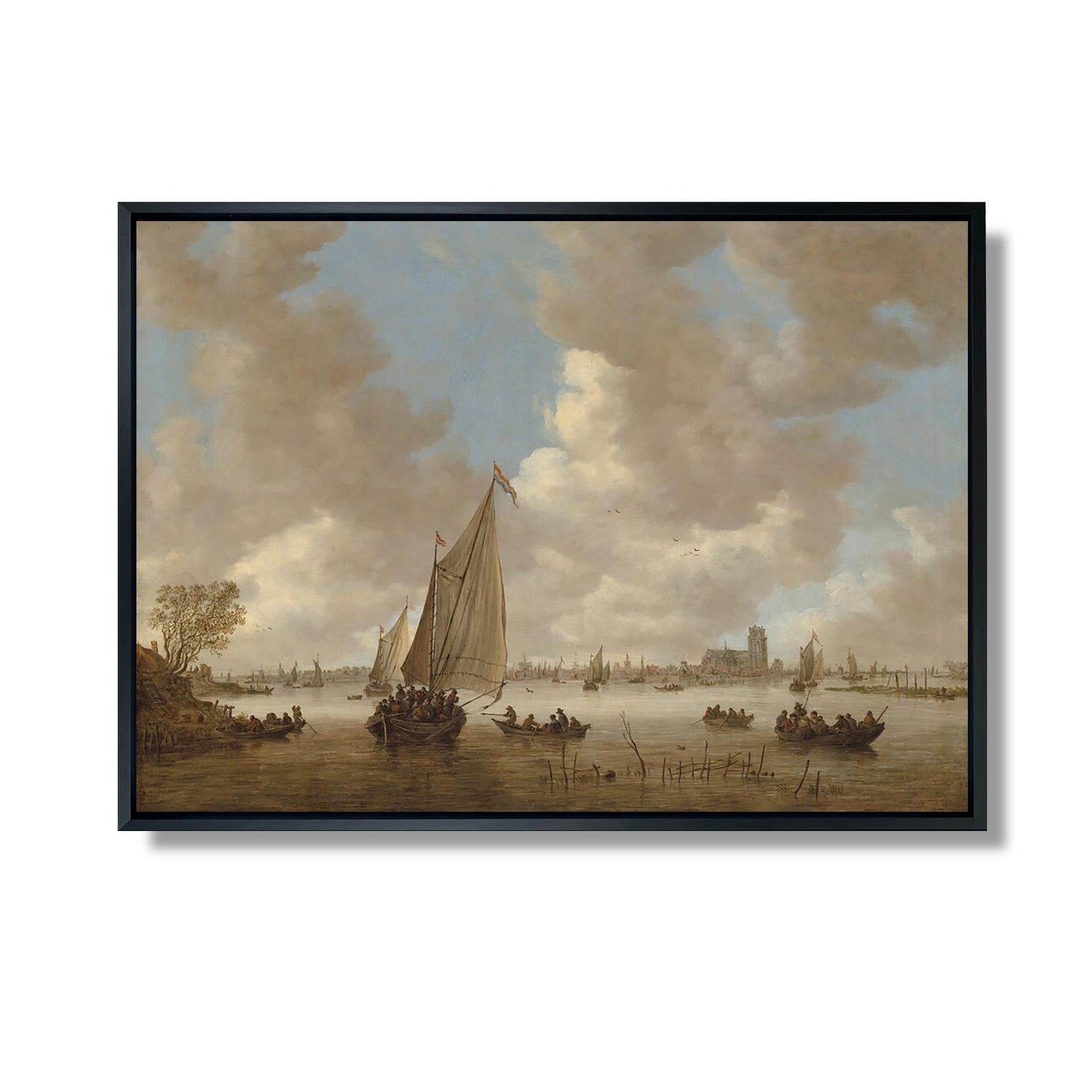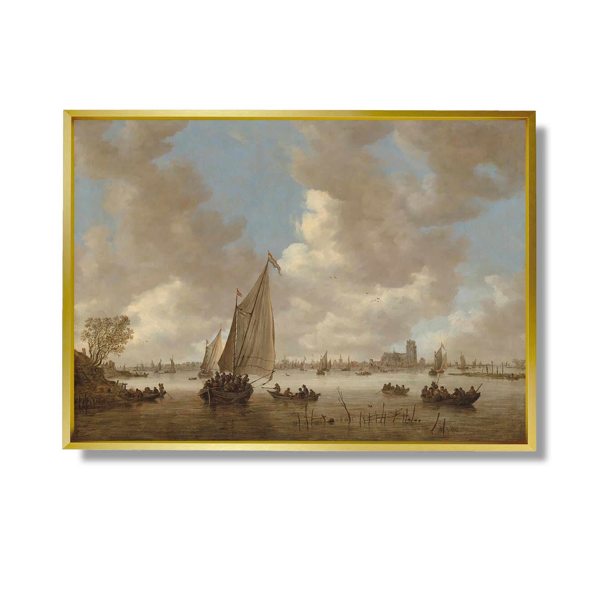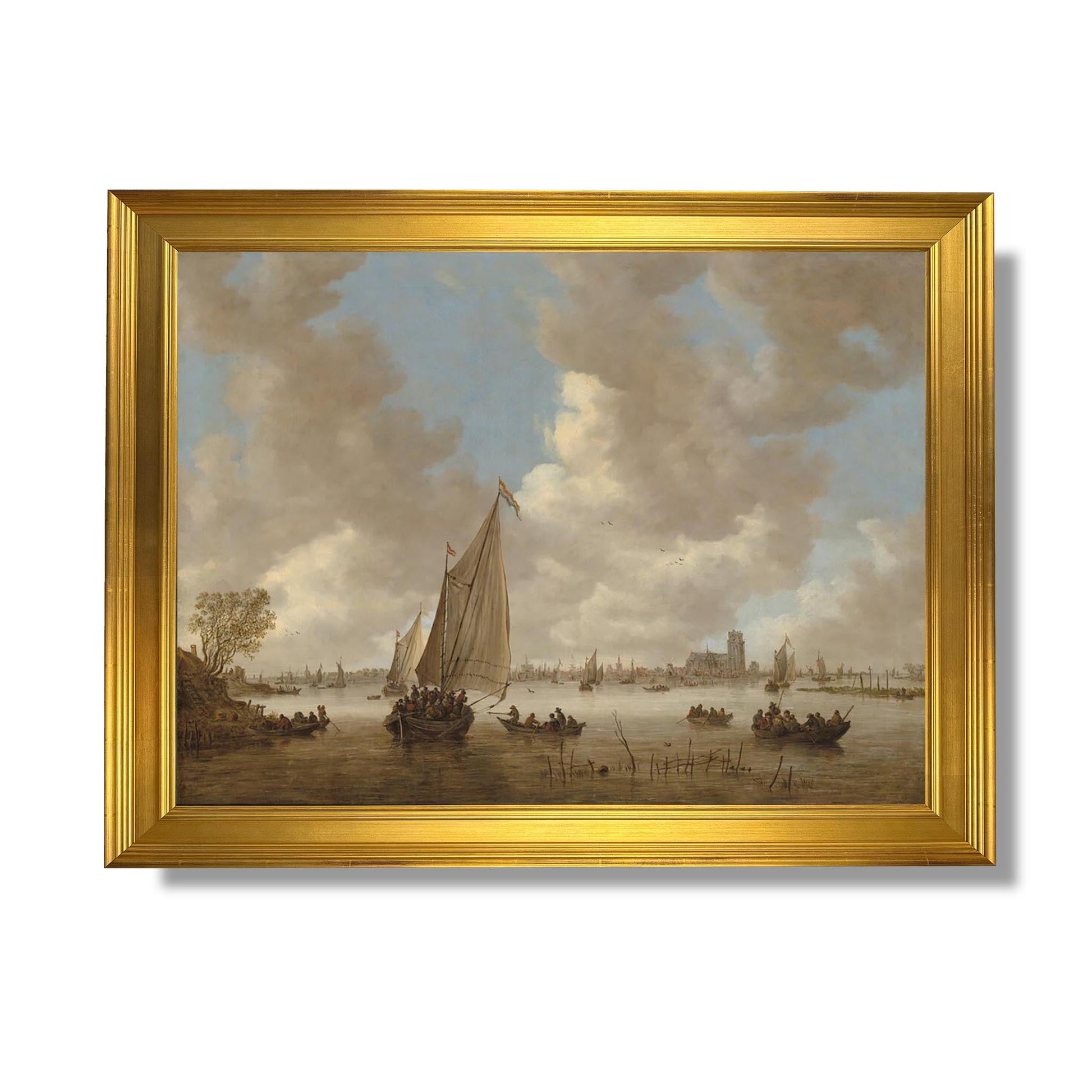 "View of Dordrecht from the North" est une œuvre emblématique de Jan van Goyen, un maître néerlandais du XVIIe siècle. Peinte en 1640, cette toile capture la ville de Dordrecht, avec ses canaux et ses bâtiments typiques, sous un ciel nuageux. Van Goyen, connu pour sa maîtrise des paysages, utilise une palette de couleurs douces et des nuances de gris pour évoquer l'atmosphère calme et mélancolique de la scène. Les détails minutieux des voiliers et des maisons reflètent la vie quotidienne de l'époque. Cette œuvre illustre parfaitement l'harmonie entre l'homme et la nature, caractéristique du paysage hollandais.