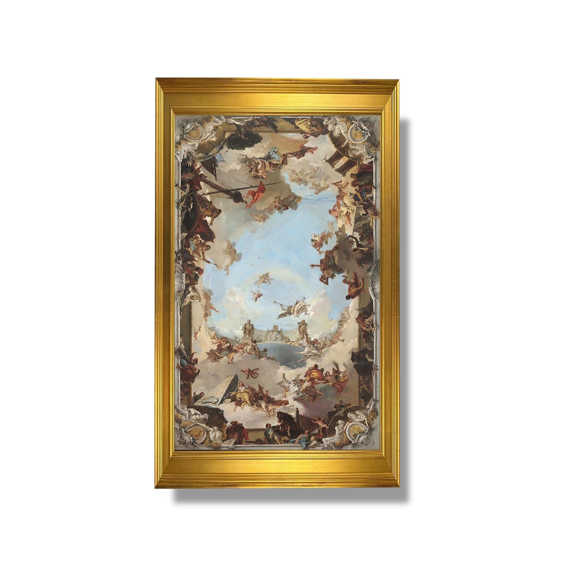 L'œuvre "Wealth and Benefits of the Spanish Monarchy under Charles III" de Giovanni Battista Tiepolo est une fresque emblématique qui illustre la grandeur et la prospérité de l'Espagne sous le règne de Charles III. Réalisée au XVIIIe siècle, cette œuvre monumentale dépeint des allégories de la richesse, de la culture et des réformes sociales initiées par le roi. Tiepolo, maître du clair-obscur et de la composition dynamique, utilise des couleurs vives et des figures majestueuses pour capturer l'esprit d'une époque de renouveau. Cette fresque témoigne de l'habileté de Tiepolo à allier art et propagande politique, célébrant ainsi l'héritage de la monarchie espagnole.