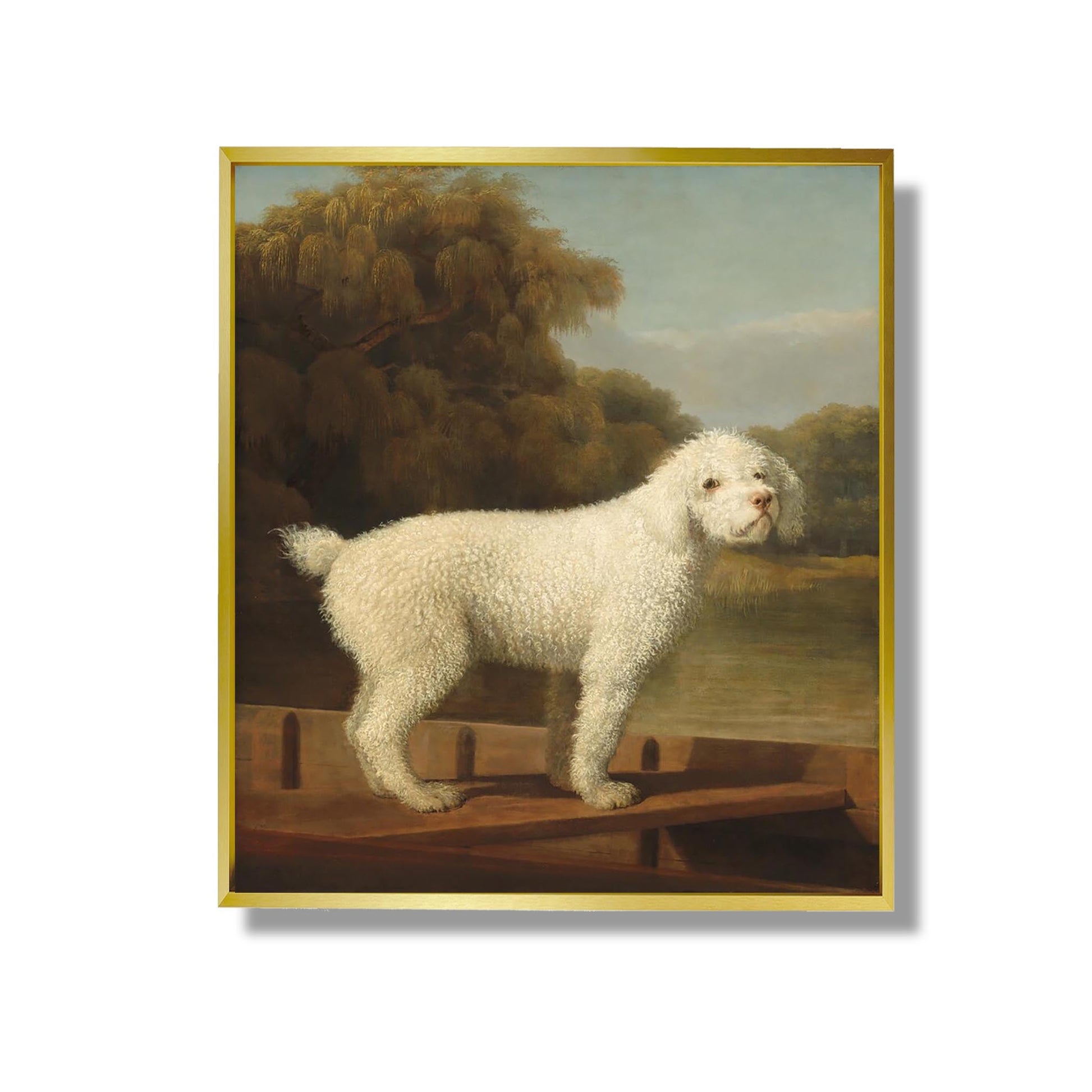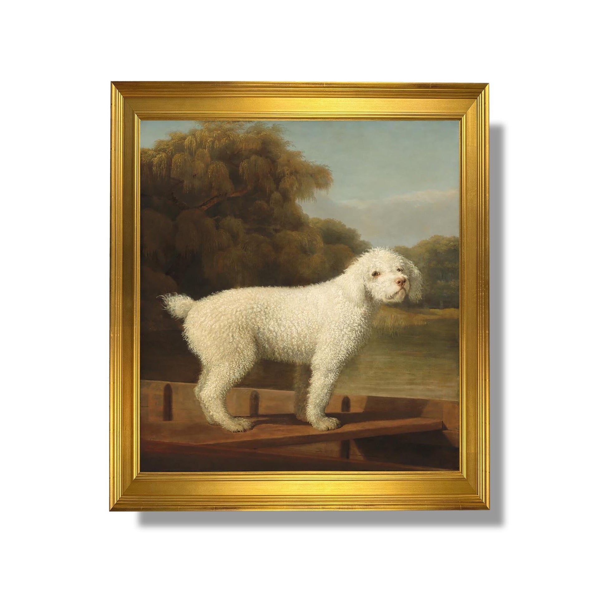"White Poodle in a Punt" est une œuvre emblématique de George Stubbs, un peintre britannique du XVIIIe siècle, célèbre pour ses représentations réalistes d'animaux. Réalisée vers 1780, cette peinture met en scène un caniche blanc, élégant et attentif, assis dans une barque. L'œuvre illustre non seulement la maîtrise technique de Stubbs dans le rendu des textures et des lumières, mais aussi son affection pour les animaux. Le caniche, symbole de raffinement, évoque la relation intime entre l'homme et son compagnon. Cette toile témoigne de l'esthétique rococo et de l'intérêt croissant pour la nature et les animaux dans l'art de l'époque.