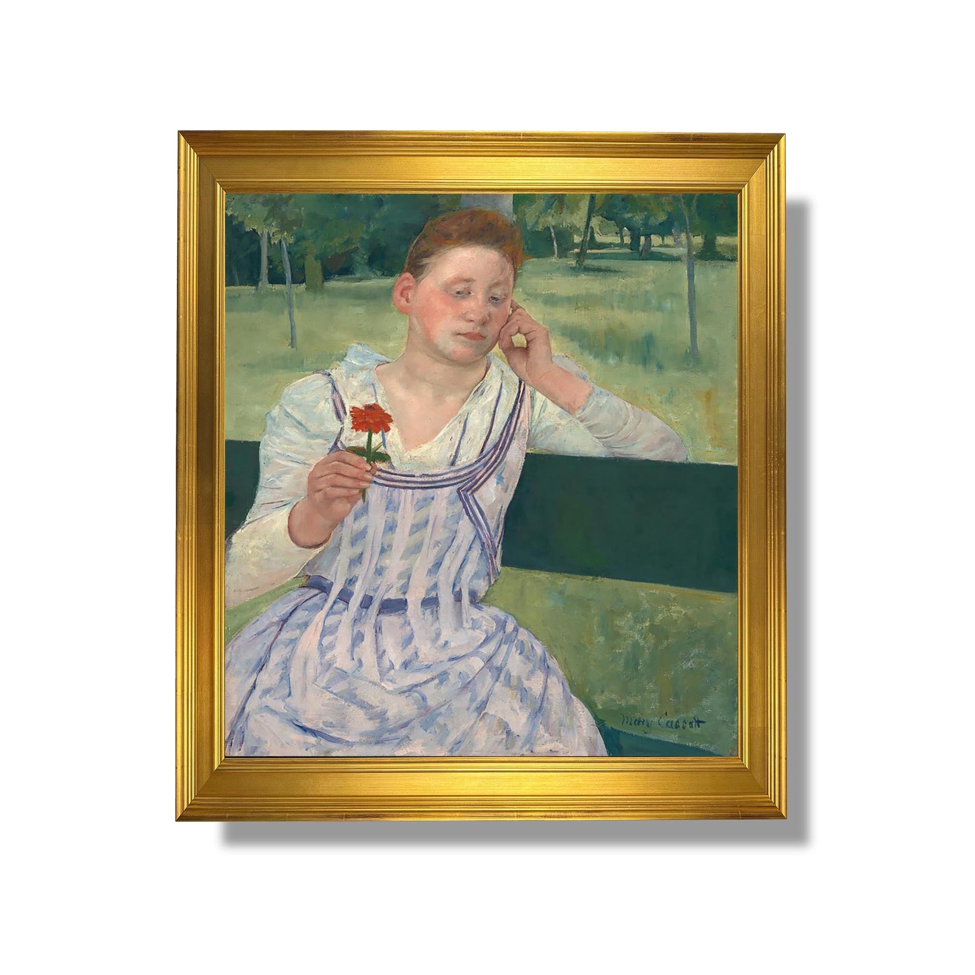 "Woman with a Red Zinnia" est une œuvre emblématique de Mary Cassatt, une artiste américaine du XIXe siècle, reconnue pour ses représentations intimes de la vie féminine. Peinte en 1898, ce tableau met en scène une femme assise, tenant une fleur éclatante, symbole de beauté et de féminité. Cassatt utilise des couleurs vives et des coups de pinceau expressifs pour capturer l'essence de son sujet. L'œuvre reflète son intérêt pour les relations interpersonnelles et la vie quotidienne des femmes, tout en s'inscrivant dans le mouvement impressionniste. Par cette peinture, Cassatt célèbre la force et la délicatesse de la condition féminine.